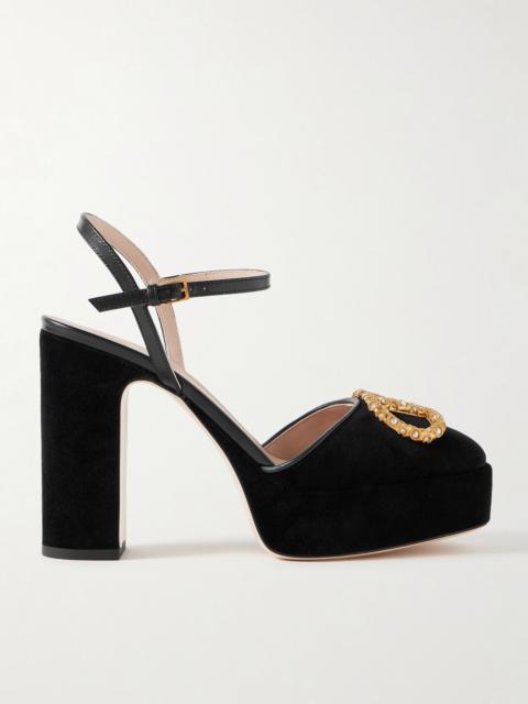 VLogo 105 embellished leather-trimmed velvet platform pumps Black