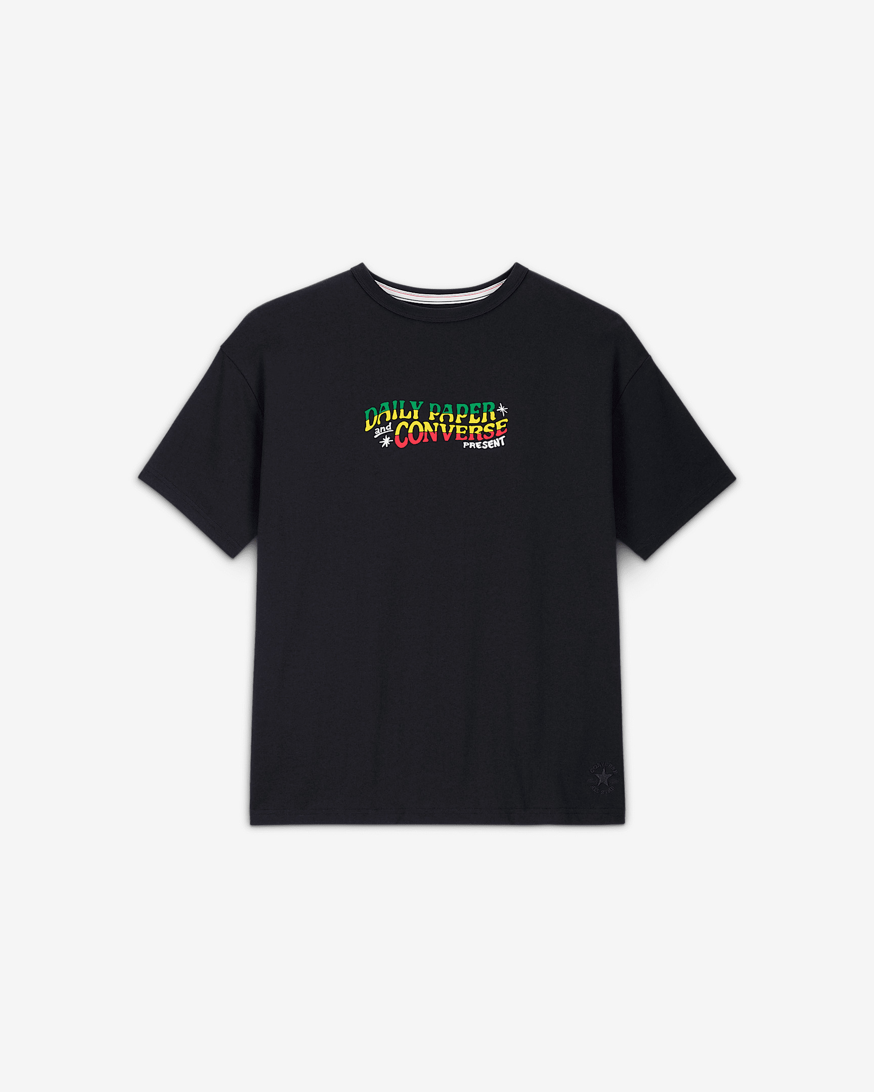 Daily Paper elevates their detail-driven blend of contemporary street style and African heritage with a limited-edition gold standard t-shirt. The design, made with Converse legacy material, features a large front graphic printed in rubber ink, an embroidered Chuck Taylor patch logo and Pan-African colors. Product Details - Limited-edition Gold Standard T-Shirt - Large rubber ink graphic on front - Embroidered tonal Chuck Taylor patch at bottom hem - 100% Cotton - Shown: Black - Style: 10027828-001
