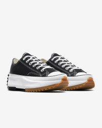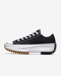 Available in a low top for the first time, the Run Star Hike's chunky platform and jagged rubber sole put an unexpected twist on your everyday Chucks. Details like a canvas build, rubber toe cap and Chuck Taylor ankle patch stay true to the original, while a molded platform, two-tone outsole and rounded heel give off futuristic vibes. Benefits - Low-top platform sneaker with canvas upper - OrthoLite insole for cushioning. - Two-tone exaggerated outsole tread. - Colorblocked design. Product Details - Shown: Black - Style: 168816C-001