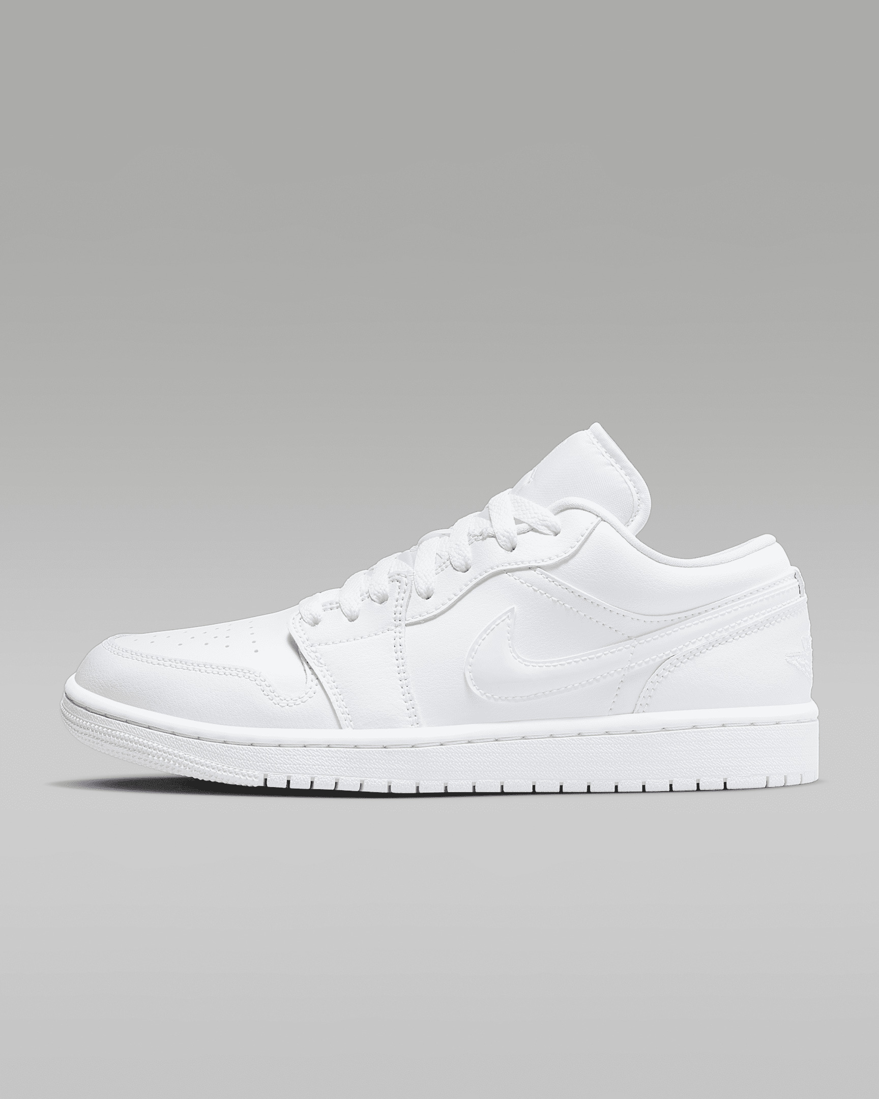 You tryna be comfortable all day, every day? We got you. The AJ1 Low has all the looks of the hoops original, with less weight and a sleek profile. Plus, they go with any 'fit—just lace up and go. Benefits - Nike Air technology absorbs impact for cushioning with every step. - Genuine and synthetic leather and textile materials combine for lightweight durability and a great fit. - Rubber outsole provides ample traction. Product Details - Jumpman logo on tongue - Stitched-down Swoosh logo - Shown: White/White/White - Style: DV0990-111