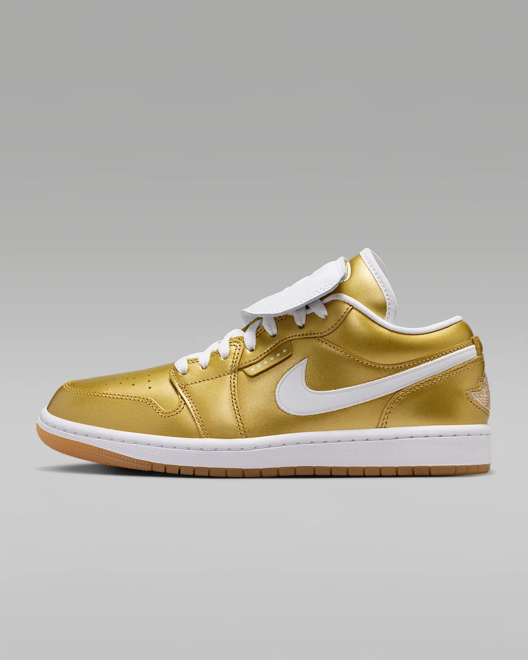 Inspired by the original that debuted in 1985, this Air Jordan 1 Low offers a soccer-inspired look that's familiar yet always fresh. With an iconic design that pairs perfectly with any 'fit, these kicks ensure you'll always be on point. Benefits - Encapsulated Air-Sole unit provides lightweight cushioning. - Genuine leather in the upper offers durability and a premium look. - Solid rubber outsole enhances traction on a variety of surfaces. Product Details - Shown: Gold/White/Gum Yellow/Gold - Style: IR2304-703