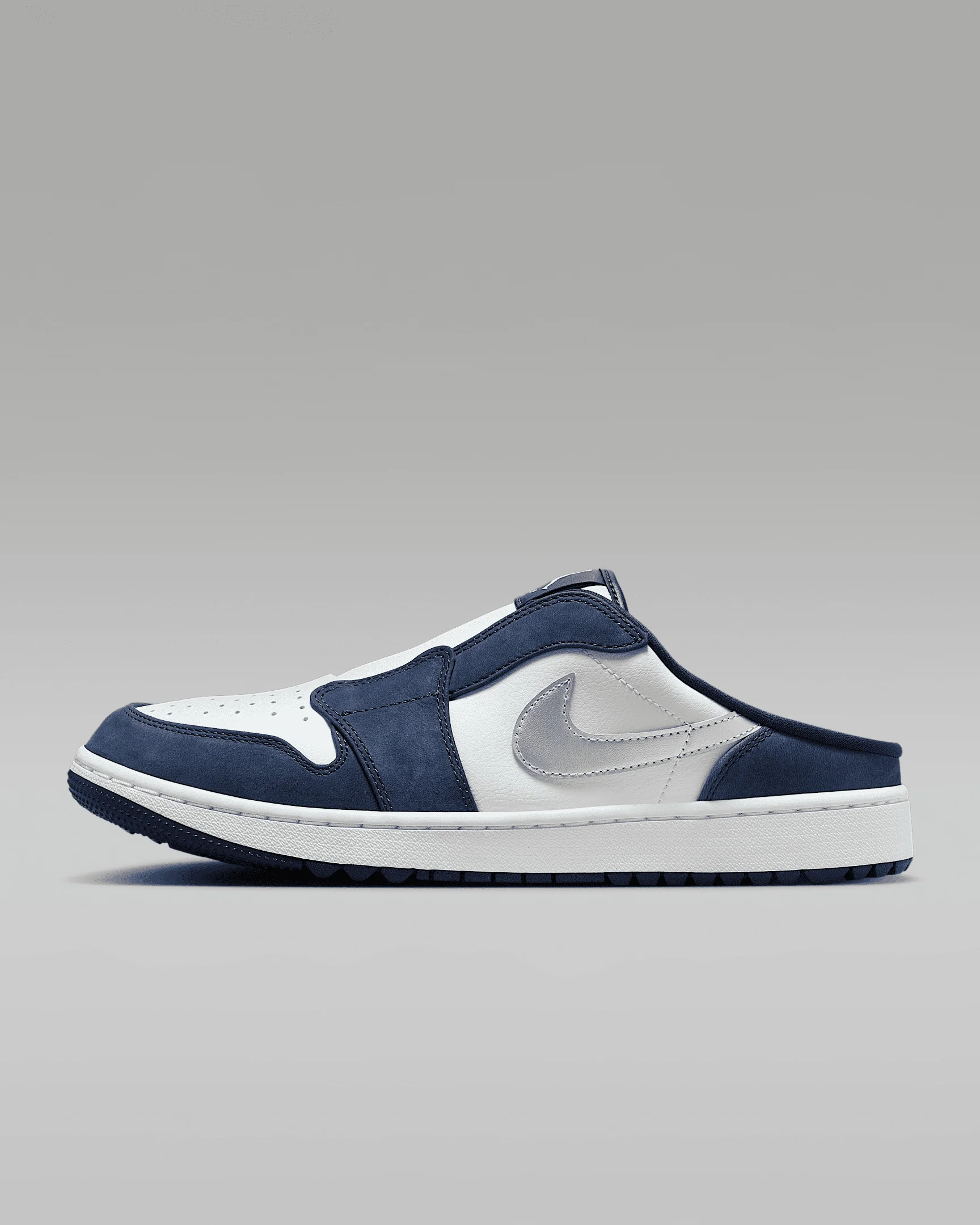 Slide into pre- and post-match paradise, whether you’re sailing to the 19th hole after a career low or ramping up for the round ahead in the all-new Jordan 1 G Mule. It’s easily accessible, eye-popping eccentric and complete with timeless Jordan ethos and comfort. More Benefits - Full-grain leather is pierced with small holes for better breathability. - The sticky outsole gives you great grip on the journey to and from the course. Product Details - Shown: White/Midnight Navy/Metallic Silver - Style: FJ1214-102