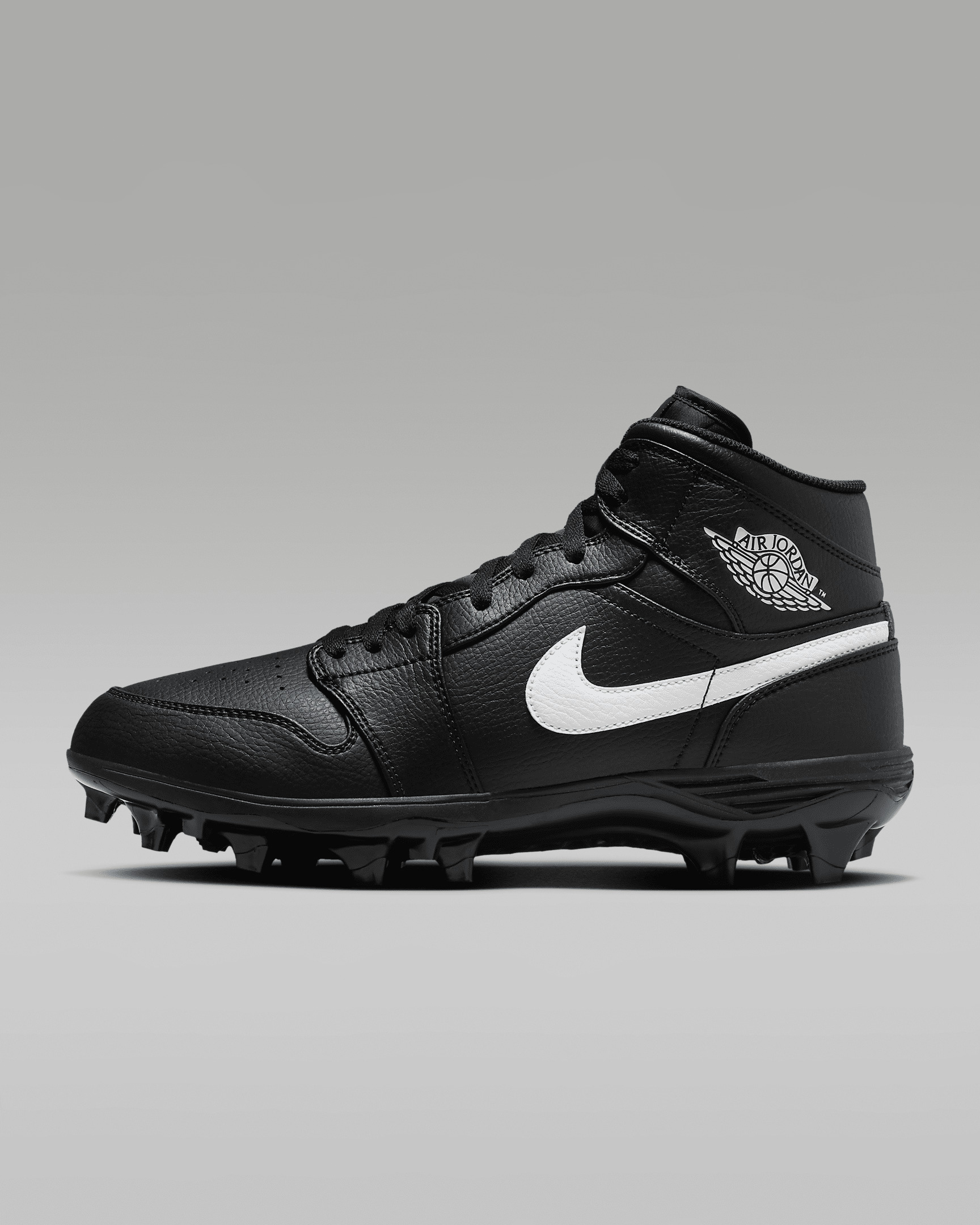 Engineered for speed, the Jordan 1 Mid TD offers a new degree of agility and quickness. Its wide stud placements help you cut faster than ever before. And the durable design is backed by synthetic leather details in the upper that help resist abrasion. Benefits - Upper takes the best parts of the AJ1 and reimagines the silhouette for a football cleat. - Wide stud placement helps you make quick cuts on the field. - External midsole provides extra comfort. Product Details - Shown: Black/Black/White - Style: FJ6805-001