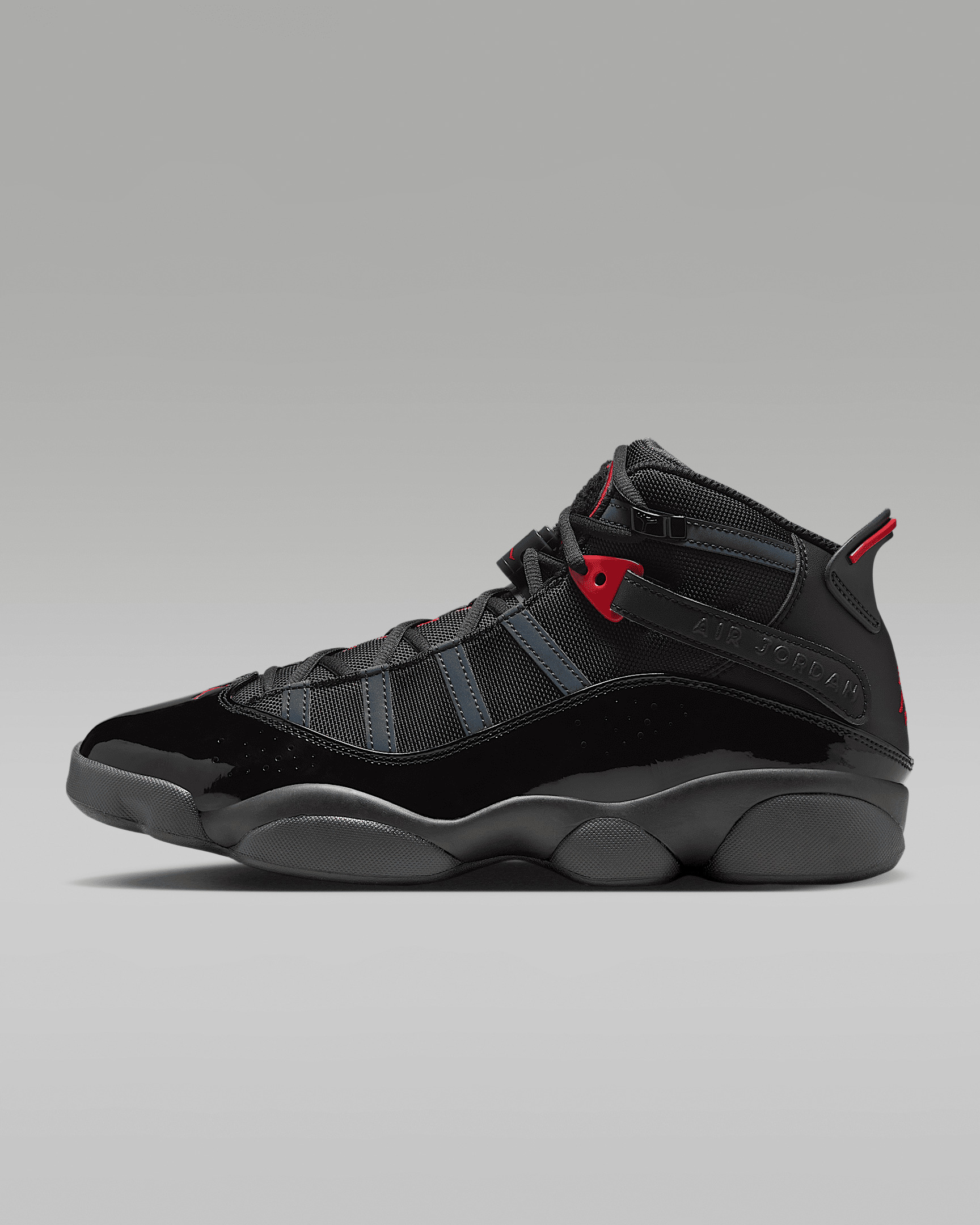 Celebrate the legendary career of "His Airness" with the Jordan 6 Rings. Incorporating key features of each shoe worn during the championship series, it has premium details and lightweight, low-profile Zoom Air cushioning that delivers a responsive feel underfoot. Benefits - Zoom Air units in the heel and forefoot provide lightweight, responsive cushioning. - Leather, synthetic leather and/or textile materials in the upper for comfort and durability. - Foam midsole for stability and lightweight cushioning. - Rubber outsole offers durability and traction. - Heel tab for easy on and off. Product Details - Shown: Black/Anthracite/Fire Red - Style: 322992-026 SIZE & FIT Fits small; we recommend ordering a half size up