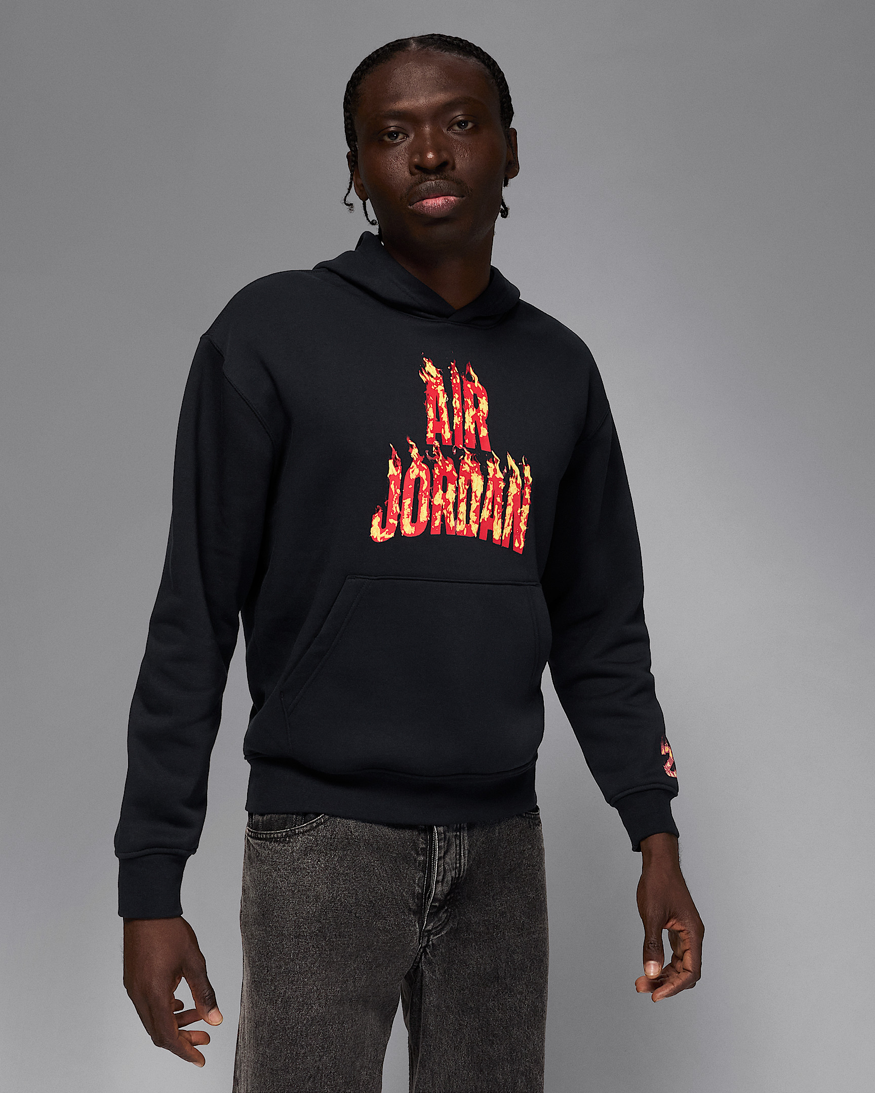 Rep the energy of this fiery AJ5 in this classic hoodie. Its midweight brushed fleece feels extra soft on the inside and smooth on the outside, helping you stay cozy while keeping its structured shape. Product Details - Body: 80% cotton/20% polyester. Hood lining: 100% cotton. Rib: 97% cotton/3% spandex. - Ribbed cuffs and hem - Machine wash - Imported - Shown: Black - Style: IQ6967-010 SIZE & FIT Model is wearing size M and is 6′2″188cm Standard fit: easy and traditional