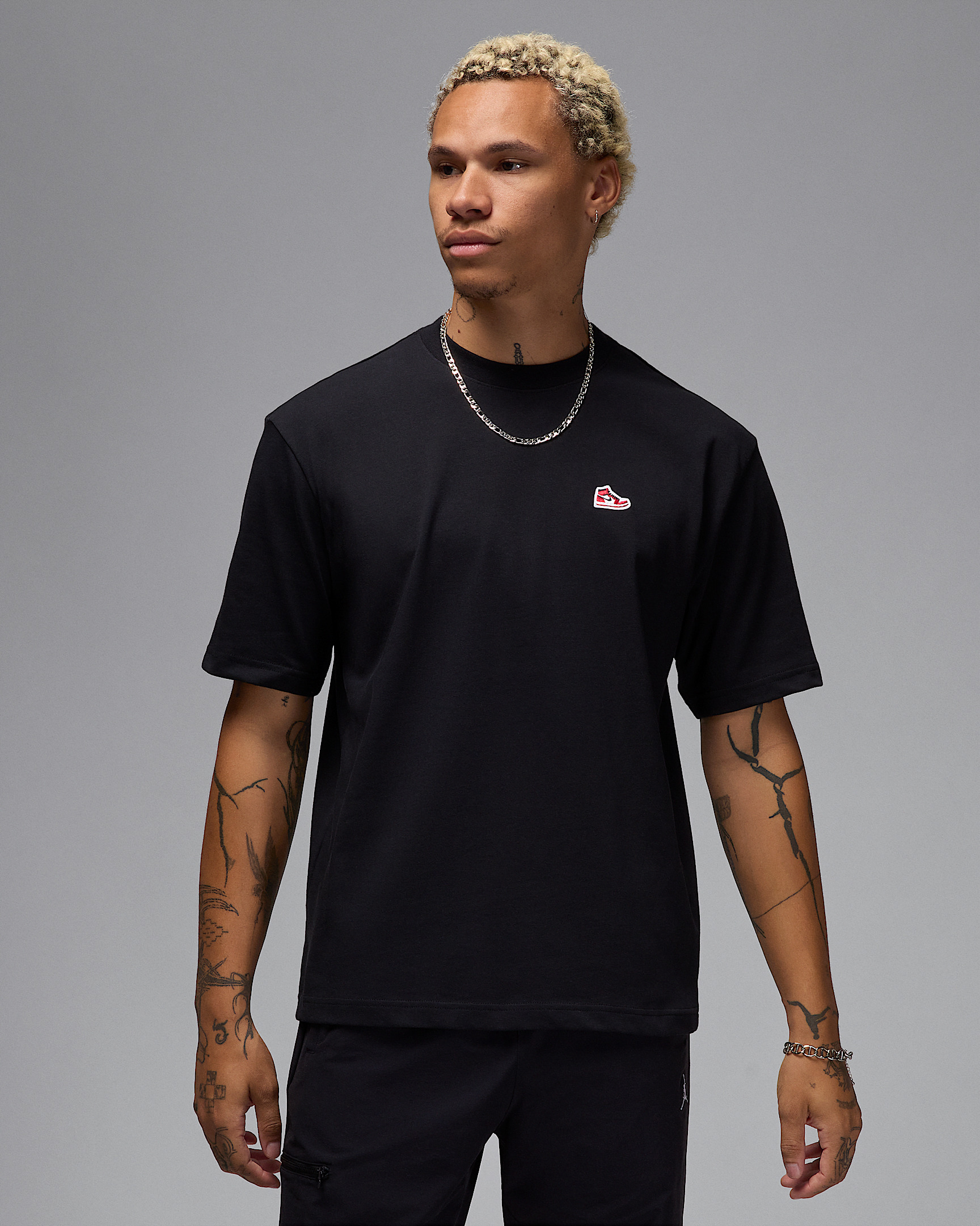 Let's cut to the chase—sometimes the AJ1 is all you need. Especially when it's sewn on a structured heavyweight cotton tee. Product Details - 100% cotton - Machine wash - Imported - Shown: Black/Varsity Red - Style: HJ2326-010 SIZE & FIT Model is wearing size M and is 6′1″185cm Standard fit: easy and traditional