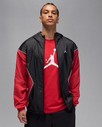 Lightweight and slick, the Draft Jacket is Jordan's take on the windbreaker. Smooth, water-repellent nylon fabric and an airy mesh lining help keep you dry and comfortable. Piping details add heritage style inspired by MJ's early warm-up looks. Benefits - Nylon shell features a water-repellent finish that helps keep you dry in wet weather. - Mesh lining helps add breathability. - Two-way zipper gives you styling options. - Zippered side pockets provide secure storage for small items. Product Details - Body: 100% nylon. Lining: 100% polyester. - Elastic cuffs and hem - Machine wash - Imported - Shown: Black/Gym Red/White/White - Style: HF9333-013 SIZE & FIT Model is wearing size M and is 6′0″183cm Loose fit: roomy and relaxed