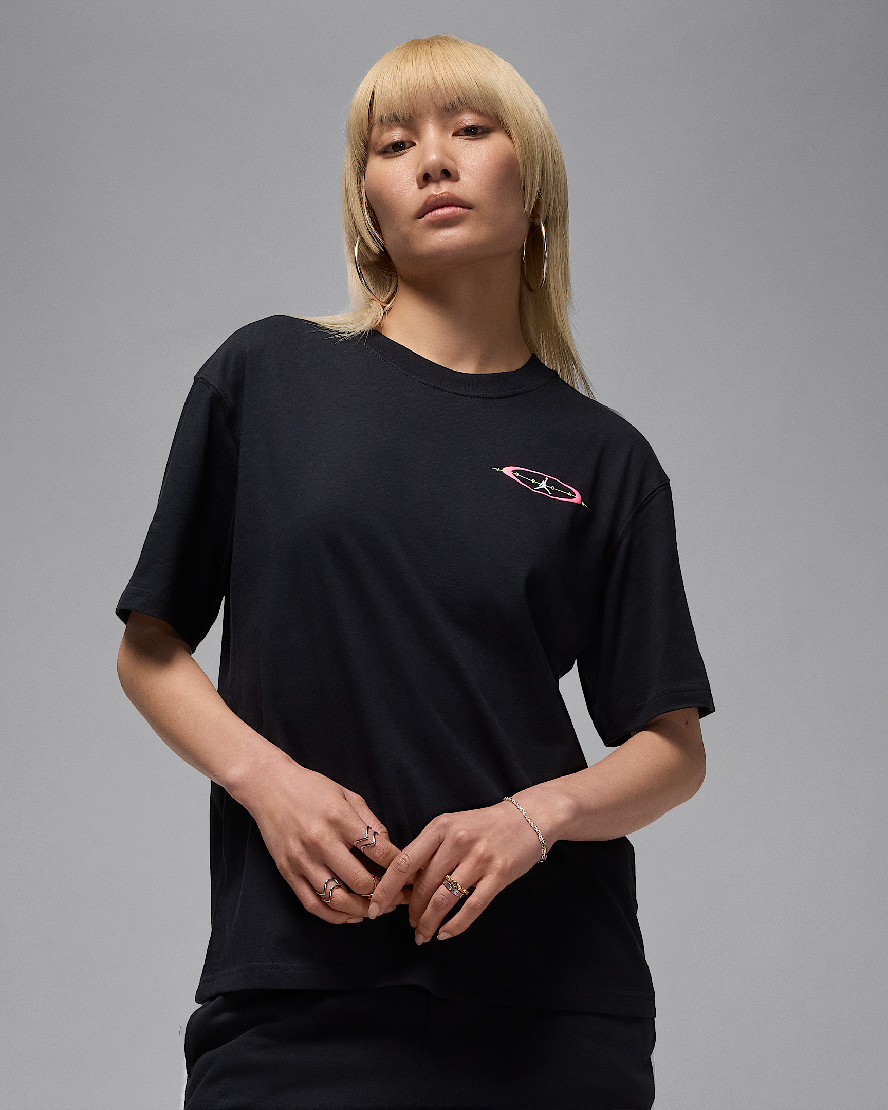 Add some retro Jordan flair to your 'fit with this roomy tee. Soft, midweight cotton keeps it feeling as good as it looks. Product Details - 100% cotton - Machine wash - Imported - Shown: Black/Digital Pink/White - Style: HV0194-010 SIZE & FIT Model is wearing size S and is 5′8″173cm Loose fit: roomy and relaxed