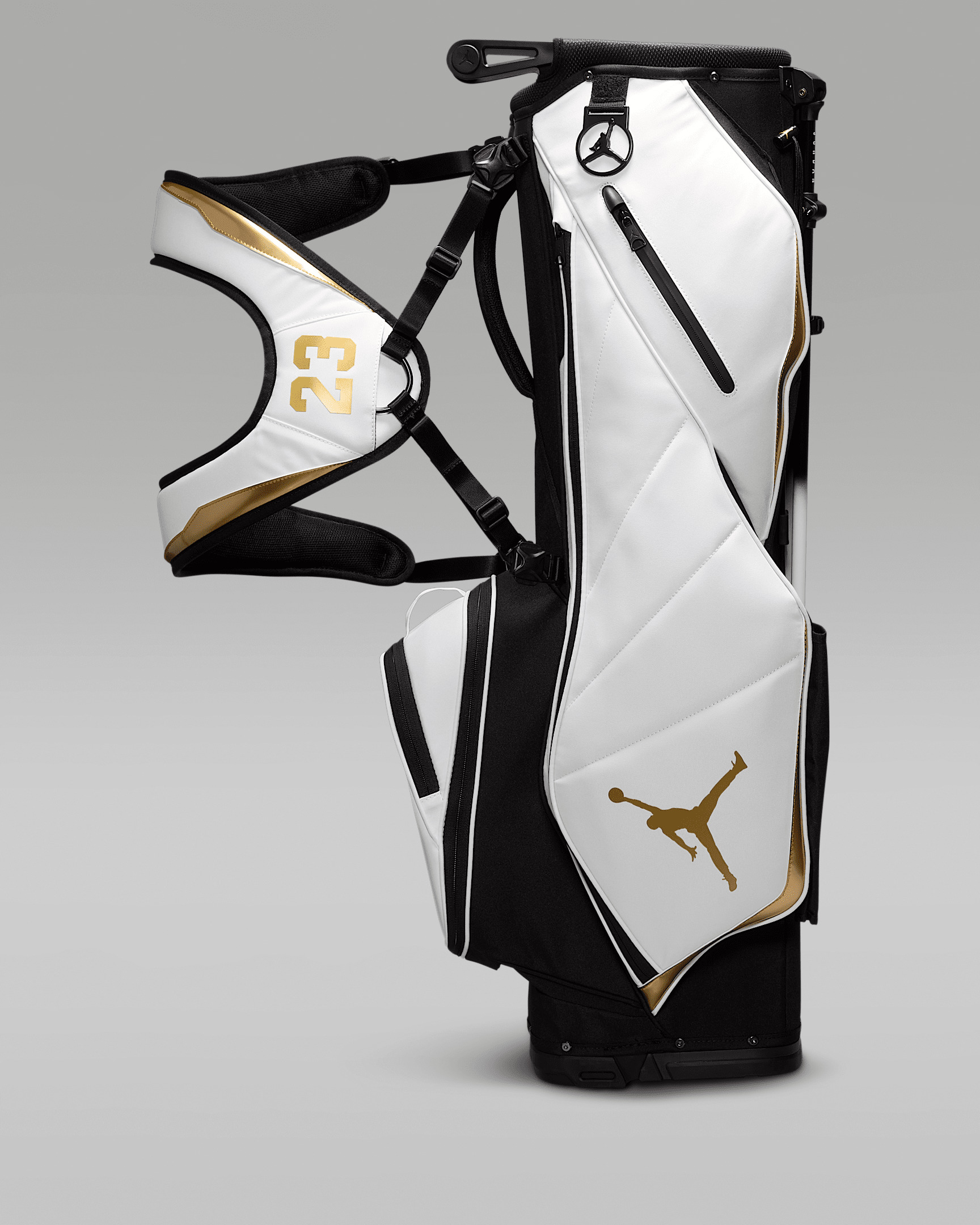 A reflection of Jordan's passion for golf, this bag combines innovation and minute details for the player who wants to take their game to the next level. Golf's well-loved traditions meet a bold, fresh design in the Jordan Golf Bag. A complete bag from top to bottom, it includes a 6-way, full-length divider system and detachable, ergonomic carrying straps. Benefits - 6-way, full-length divider system keeps your clubs organized. - Detachable, ergonomic strap can be worn over 1 or both shoulders. - Soft, velour-lined pocket helps to protect your tech and valuables. - Matching rain hood helps keep your gear dry. - Air Jordan 14-inspired towel ring allows you to access your golf towel easily. - Air Jordan 6-inspired lace-lock umbrella cinch allows you to play in inclement weather. Product Details - 34"H x 13"W - Body: 95% polyester/5% PU leather. Lining: 100% polyester. - Imported - Shown: White - Style: J1008184-109
