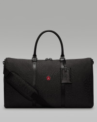 Travel like an icon with this duffel, made of durable fabric and featuring an allover woven elephant skin pattern that perfectly complements your Jordans. The spacious main compartment can easily hold your things for an overnight trip, hitting the gym, or anything else. Faux leather handles and trims elevate the bag's overall look and the adjustable shoulder strap is removable for versatile carry and wear options. Benefits - The interior zip pocket can help secure smaller items you don't want lost in the main compartment. - Use the included luggage tag to identify your bag when you travel. Product Details - 12"H x 21.5"L x 9.5"D; Handle Drop: 7"; Strap Length: 51" (longest), 31.74" (shortest) - Main Body/Lining: 100% Polyester; Handles/Piecings: 100% Polyurethane - Spot Clean - Imported - Shown: Off Noir - Style: LM9021-G0T