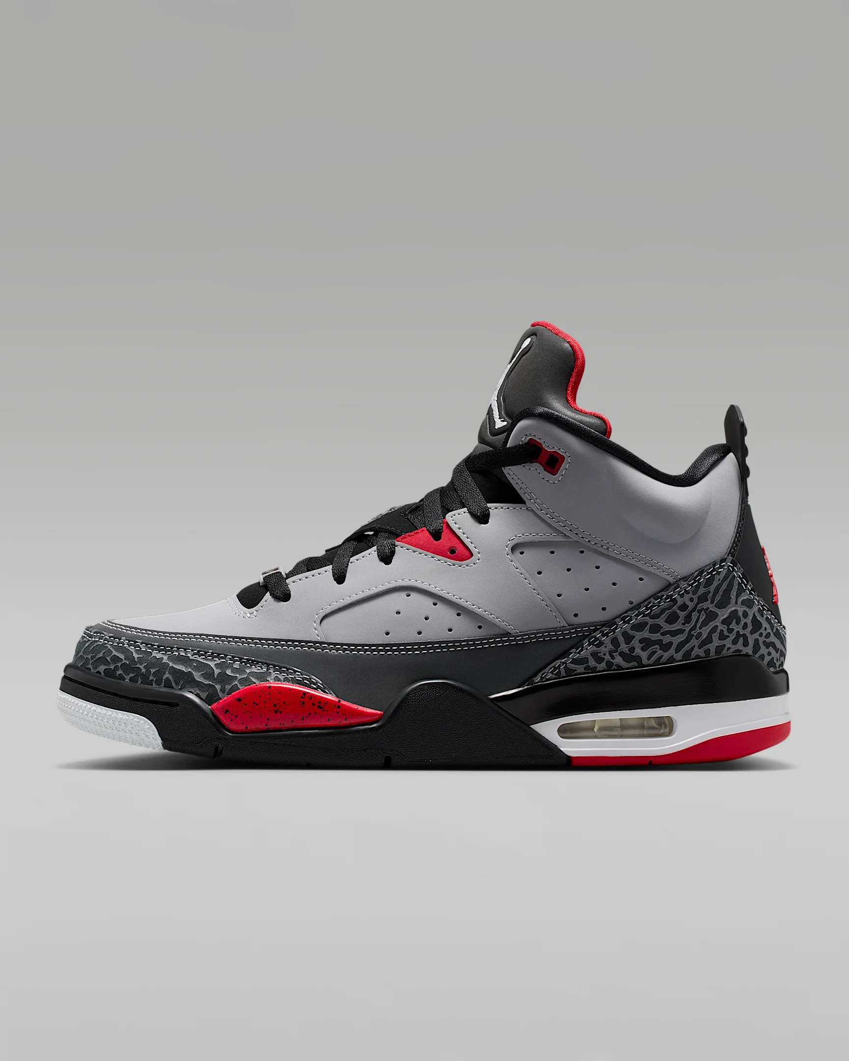 The Jordan Son of Mars Low plays it cool in a design that celebrates the intersection of Mike, Spike and the legendary ad campaign that brought them together. Real and synthetic leather combine for comfort and durability, while classic Jordan details make it a legend. Benefits - Real and synthetic leather overlays in the upper for durable support. - Perforated side panels in the upper for breathability. - Full-length foam midsole is durable and offers stability. - Visible Air-Sole unit for cushioning and impact protection. Product Details - Shown: Cement Grey/Black/Fire Red/White - Style: 580603-004