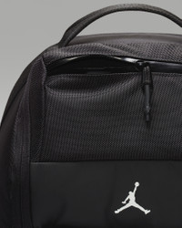 Carry your stuff in DNA style with this spacious Jordan backpack. The spacious main zippered compartment can hold books, a change of clothes or whatever else you need. The zippered compartment on the back is padded to help secure a laptop or tablet. Keep up with hydration by using the side bottle pockets, the laced bungee cord on the front can be used to hold something extra and the adjustable padded straps provide comfortable wear. What really puts this backpack over the top are the organizational pockets and the ventilated shoe garage at the bottom! Product Details - 20.5"H x 12.5"L x 8"D; Strap Length: 38" (longest), 19" (shortest) - 100% Polyester - Spot Clean - Imported - Shown: Black - Style: MA0945-023
