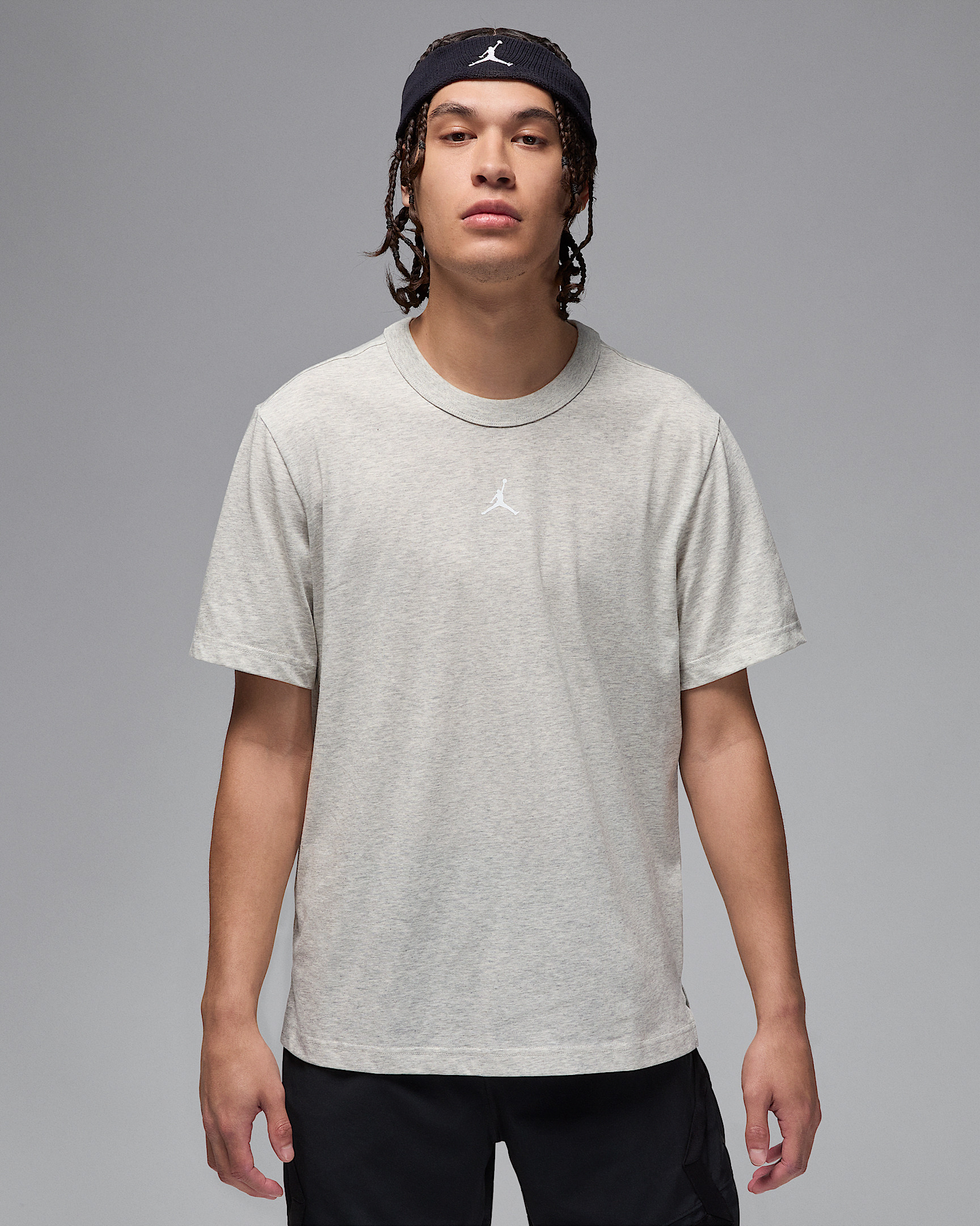 Here's a tee that's made for getting after it. It's made of a soft cotton blend enhanced with sweat-wicking technology to help keep you fresh from wake up to wind down. Benefits - Nike Dri-FIT technology moves sweat away from your skin for quicker evaporation, helping you stay dry and comfortable. - Minimalist screen-printed Jumpman keeps your look straightforward. Product Details - 57% cotton/43% polyester - Machine wash - Imported - Shown: Grey Heather/White - Style: FN5829-050 SIZE & FIT Model is wearing size M and is 5′10″178cm Standard fit: easy and traditional