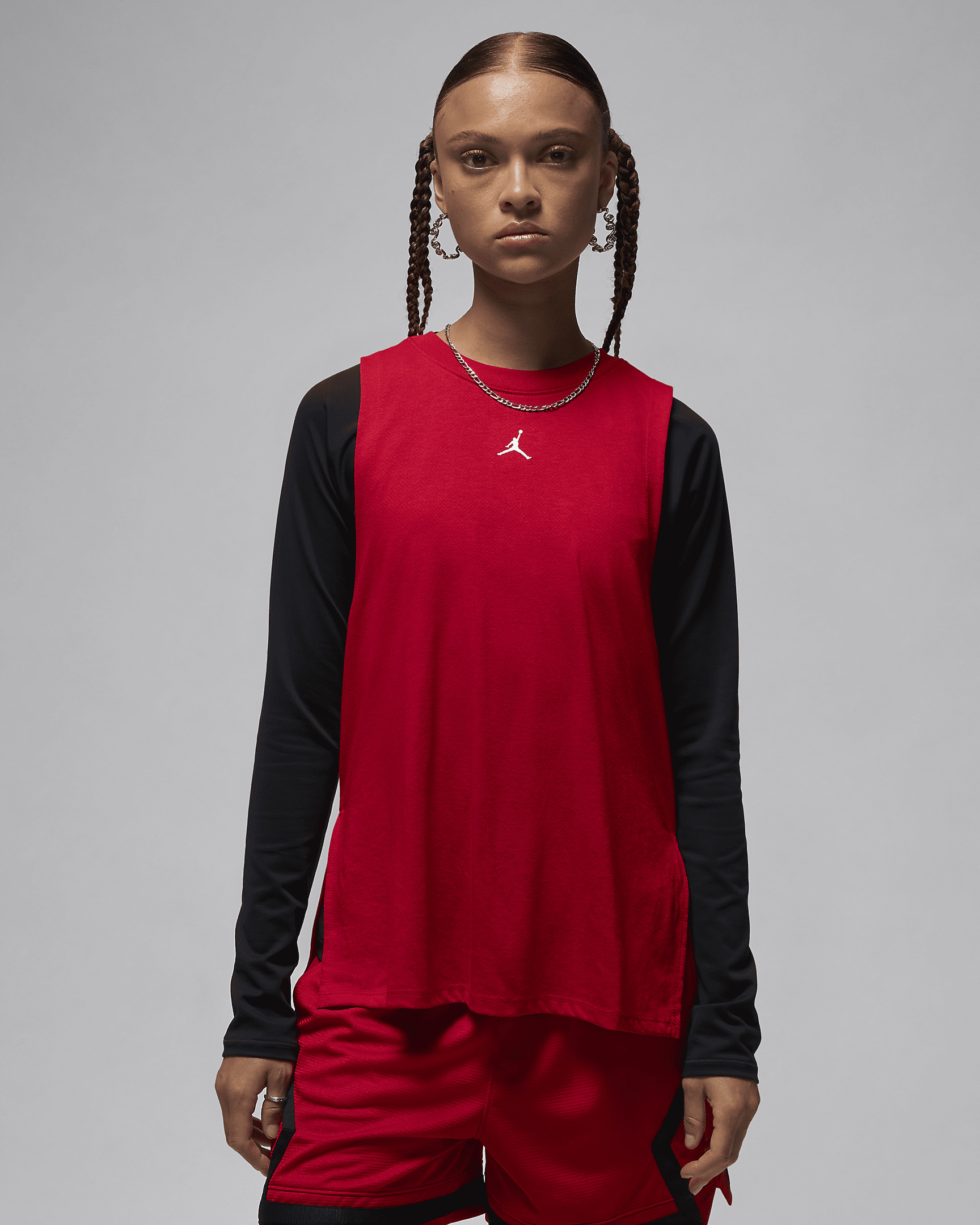 Breeze through your workouts in this lightweight mesh tank. Loose-fitting with a hem that hits below the waist, it's designed to let you move freely. And check out the panel on the back—its Diamond shape recalls one of Jordan's most iconic designs. Benefits - Nike Dri-FIT technology moves sweat away from your skin for quicker evaporation, helping you stay dry and comfortable. - Side slits for added ventilation and ease of movement. - Lightweight power mesh panel on the back increases breathability. Product Details - Center front Jumpman in rubber print - Body: 76% polyester/12% cotton/12% rayon. Inset: 81% nylon/19% spandex. - Machine Wash - Imported - Shown: Gym Red/White - Style: FB4629-687 SIZE & FIT Model is wearing size S and is 5′9″175cm Loose fit: roomy and relaxed