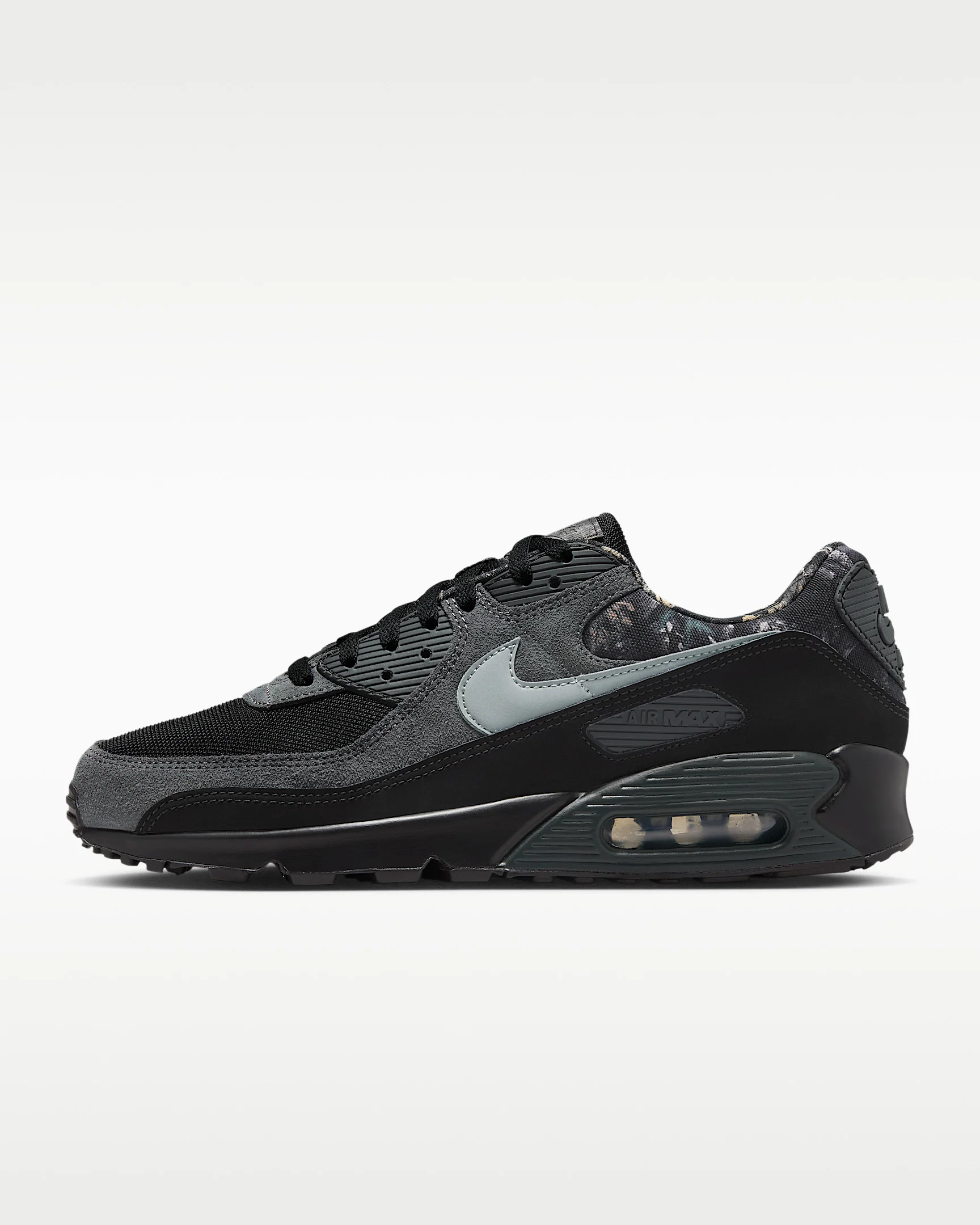 The Air Max 90 stays true to its running roots with the iconic Waffle sole, while stitched overlays and textured accents create the '90s look you love. Finished with easy-to-style colors, its visible cushioning adds comfort to your journey. Benefits - Textile, genuine and synthetic leather upper with synthetic overlays creates a layered look that lasts. - Nike Air technology absorbs impact for cushioning with every step. - Rubber Waffle outsole delivers durable traction and heritage style. Product Details - Padded collar - Foam midsole - Reflective Details - Not intended for use as Personal Protective Equipment (PPE) - Shown: Black/Dark Smoke Grey/Metallic Cool Grey - Style: IQ0300-001