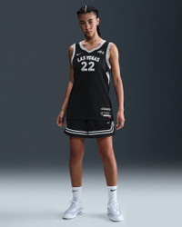 Got dreams to be the next A'ja Wilson? The first step is looking the part. This relaxed-fit replica jersey gives you details modeled after what the Aces wear on the court and lets you rep your favorite player everywhere you go. Benefits - Nike Dri-FIT technology moves sweat away from your skin for quicker evaporation, helping you stay dry and comfortable. - Lightweight knit fabric feels smooth against your skin. Product Details - 100% polyester - Machine wash - Imported - Shown: Black/Flat Silver/White - Style: HF0996-010 SIZE & FIT Model is wearing size S and is 5′9″175cm Loose fit: roomy and relaxed