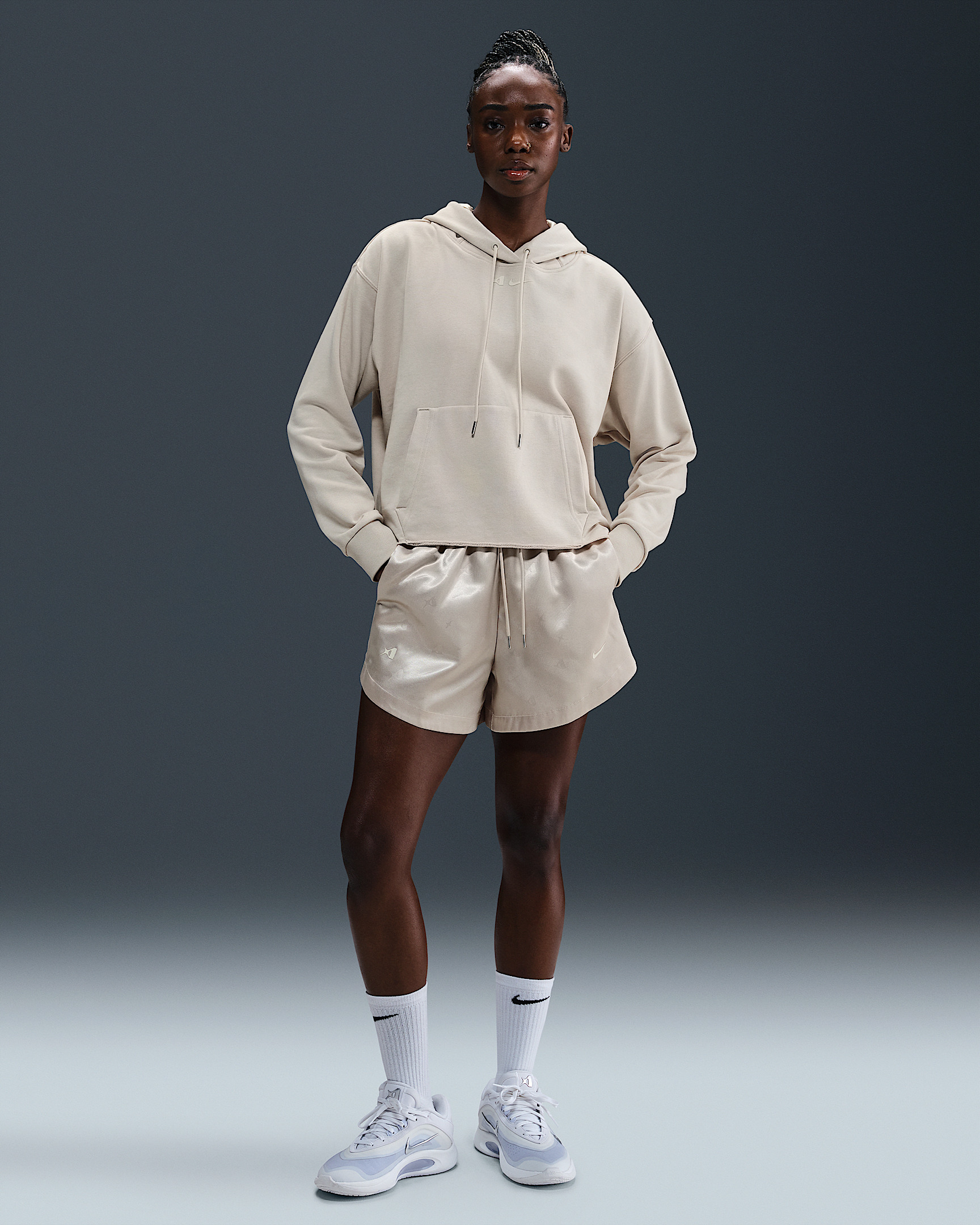 Unapologetic comfort meets unapologetic attitude. Take a page from A'ja Wilson's book and embrace your boldest self in these satin shorts. Embossed with star power, they have a silky feel and luxurious sheen while still wicking sweat when your game heats up. Product Details - Hand pockets - 100% polyester - Machine wash - Imported - Shown: Desert Sand/Soft Pearl - Style: HM7710-008 SIZE & FIT Model is wearing size S and is 5′9″175cm Standard fit: easy and traditional