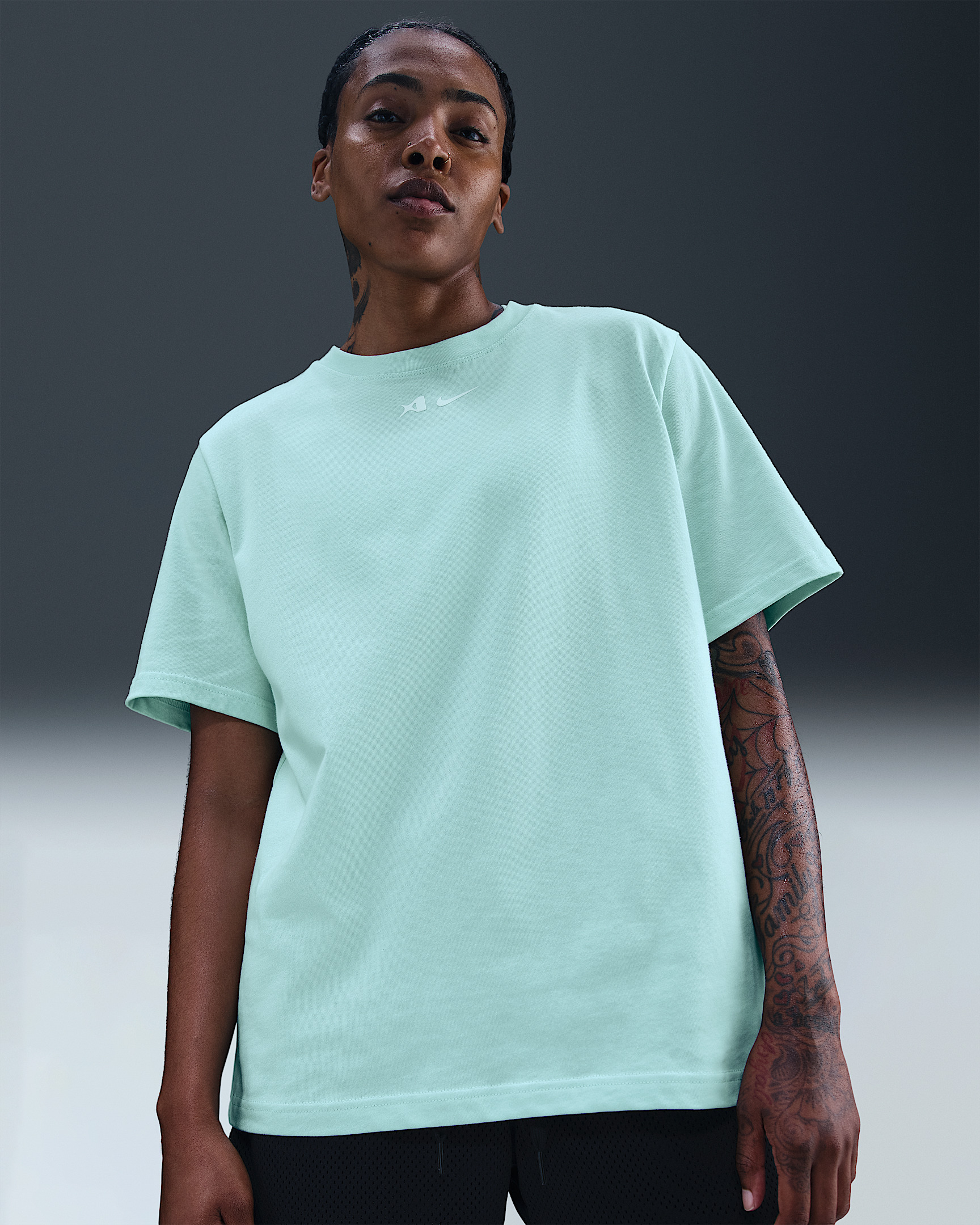 Unapologetic comfort meets unapologetic attitude. With structured, heavyweight cotton and a roomy fit, this tee honors the strength of A'ja's game. Benefits - A loose fit provides a comfortable, confident feel. - Built around the star she's always drawn into her signature, A'ja's logo is strong, bold and playful—just like the energy she brings to the court. Product Details - 100% cotton - Printed graphics - Machine wash - Imported - Shown: Jade Ice/White - Style: HQ1696-346 SIZE & FIT Loose fit: roomy and relaxed