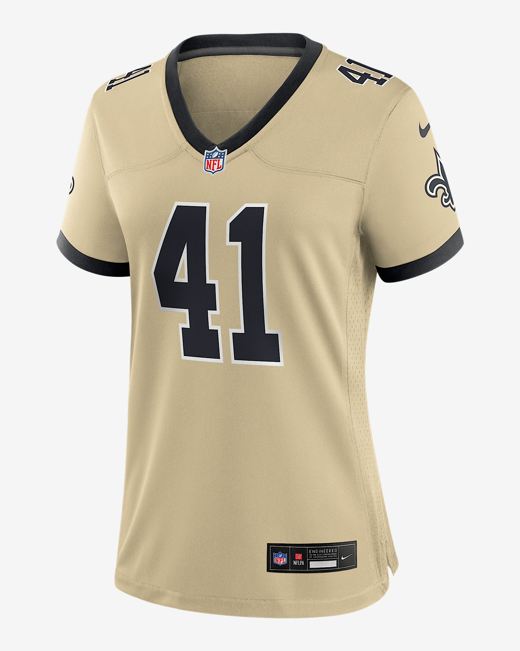 Rep one of your team's top stars with this Alvin Kamara Jersey. Proper ventilation and a form fit help provide a dry, comfortable wear with the authentic look of the on-field uniform for the New Orleans Saints. Benefits - Screen-printed name, number and team mark offer lightweight durability. - Ventilation over major heat zones helps keep you cool. Product Details - Standard fit for a relaxed, easy feel - NFL shield at V-neck - Tagless neck label - Woven jock tag - 100% polyester - Machine wash - Imported - Shown: Gold - Style: 67NW0EBM7WF-NZ1