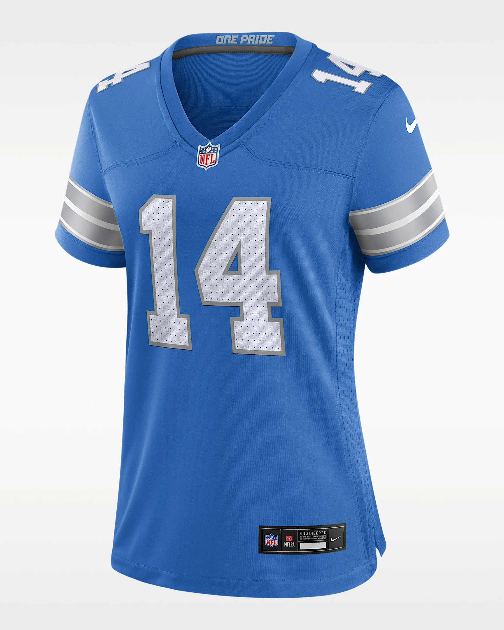 Rep one of your team's top stars with this Detroit Lions Jersey. Proper ventilation and a form fit help provide a dry, comfortable wear with the authentic look of the on-field uniform. Benefits - Screen-printed name, number and team mark offer lightweight durability. - Ventilation over major heat zones helps keep you cool. Product Details - Standard fit for a relaxed, easy feel - NFL shield at V-neck - Tagless neck label - Woven jock tag - 100% polyester - Machine wash - Imported - Shown: Blue - Style: 67NW0B9K9JF-DE3
