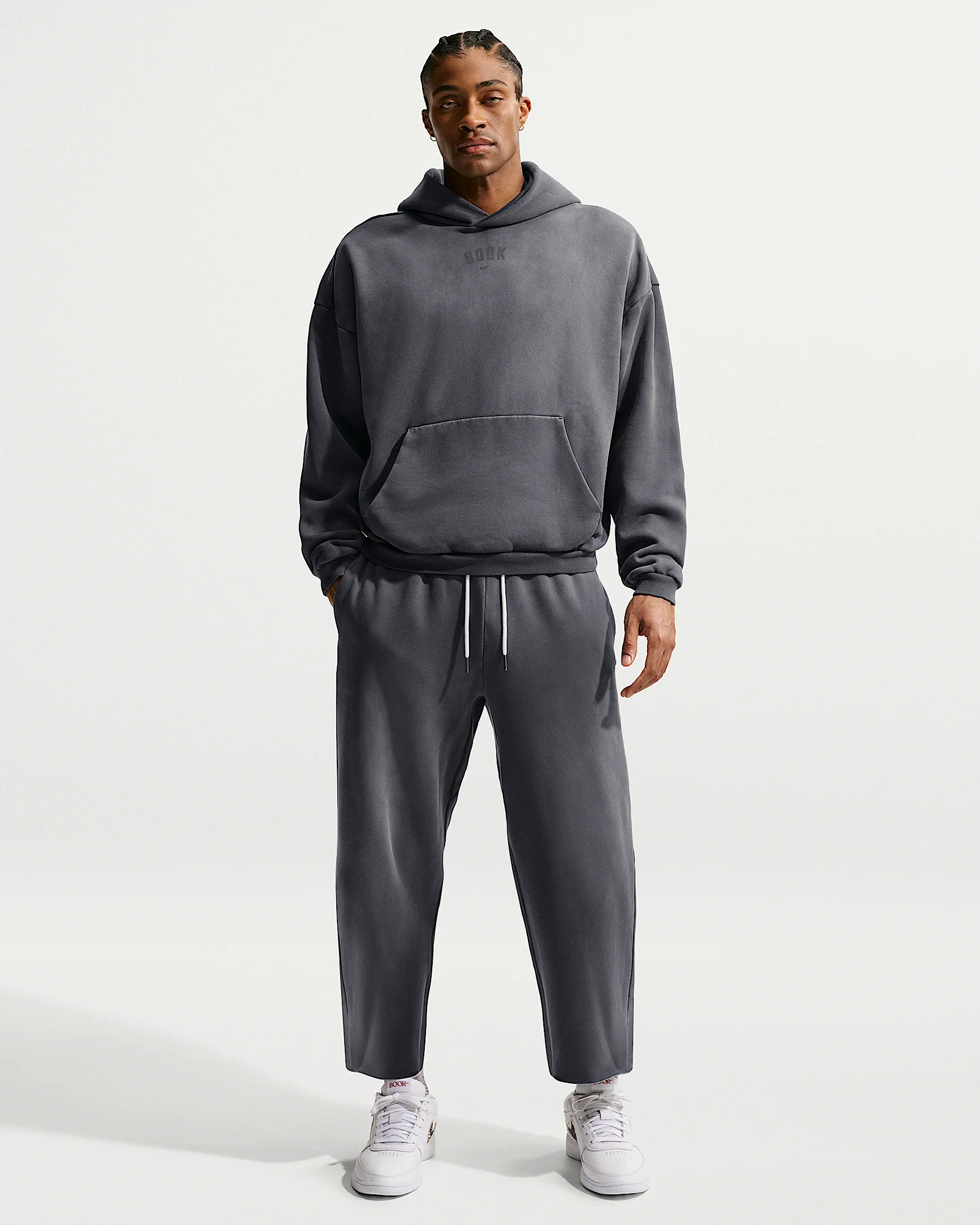 Devin Booker’s game is all about quiet confidence—effortless, yet elite. His style? Just the same. Our heavyweight Standard Issue pants have a roomy fit, plus get the Book treatment with a refined dye-and-wash finish and subtly faded graphics that honor his evolving legacy. Product Details - Hidden side seam pocket - Side pockets - Elastic waistband with drawcord - Body: 80% cotton/20% polyester. Pockets: 100% cotton. - Machine wash - Imported - Shown: Black/Black - Style: II3923-010 SIZE & FIT Model is wearing size M and is 6′2″188cm Loose fit: roomy and relaxed