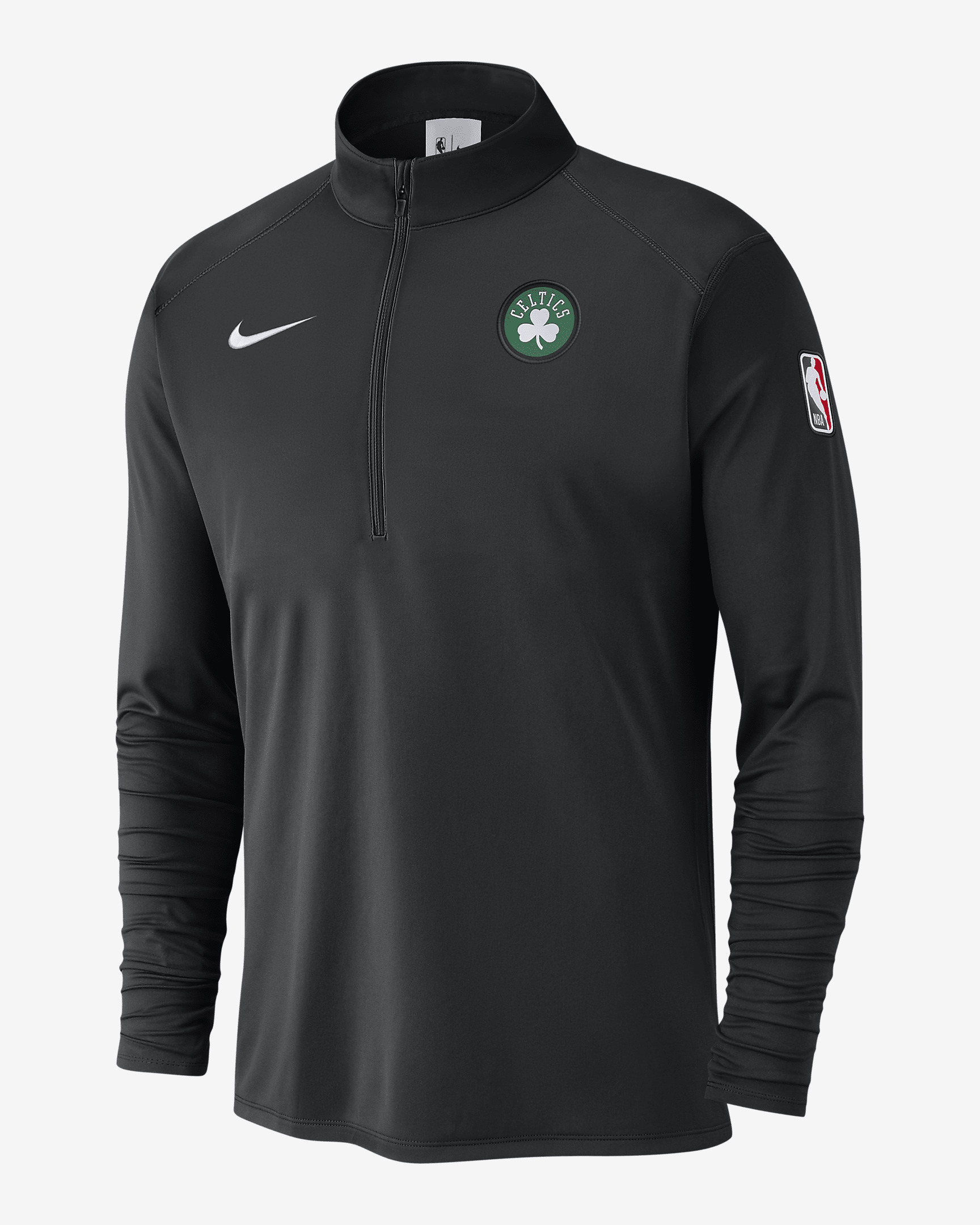 Layer up in the lightweight comfort of this sweat-wicking Boston Celtics long-sleeve top. Marked with subtle league and squad logos, it shows off your love of the game—and your team. Benefits - Nike Dri-FIT technology moves sweat away from your skin for quicker evaporation, helping you stay dry and comfortable. - Lightweight, breathable knit fabric and a 1/2-zip design make this a versatile layer. Product Details - 91% polyester/9% spandex - Machine wash - Imported - Shown: Black/Black/White - Style: FV2158-010 SIZE & FIT Standard fit: easy and traditional
