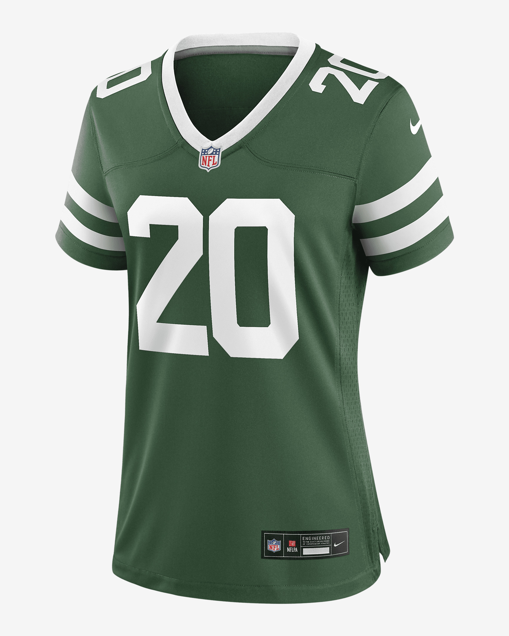 Rep one of your team's top stars with this New York Jets Jersey. Proper ventilation and a form fit help provide a dry, comfortable wear with the authentic look of the on-field uniform. Benefits - Screen-printed name, number and team mark offer lightweight durability. - Ventilation over major heat zones helps keep you cool. Product Details - Standard fit for a relaxed, easy feel - NFL shield at V-neck - Tagless neck label - Woven jock tag - 100% polyester - Machine wash - Imported - Shown: Green - Style: 67NW03T672F-GT9