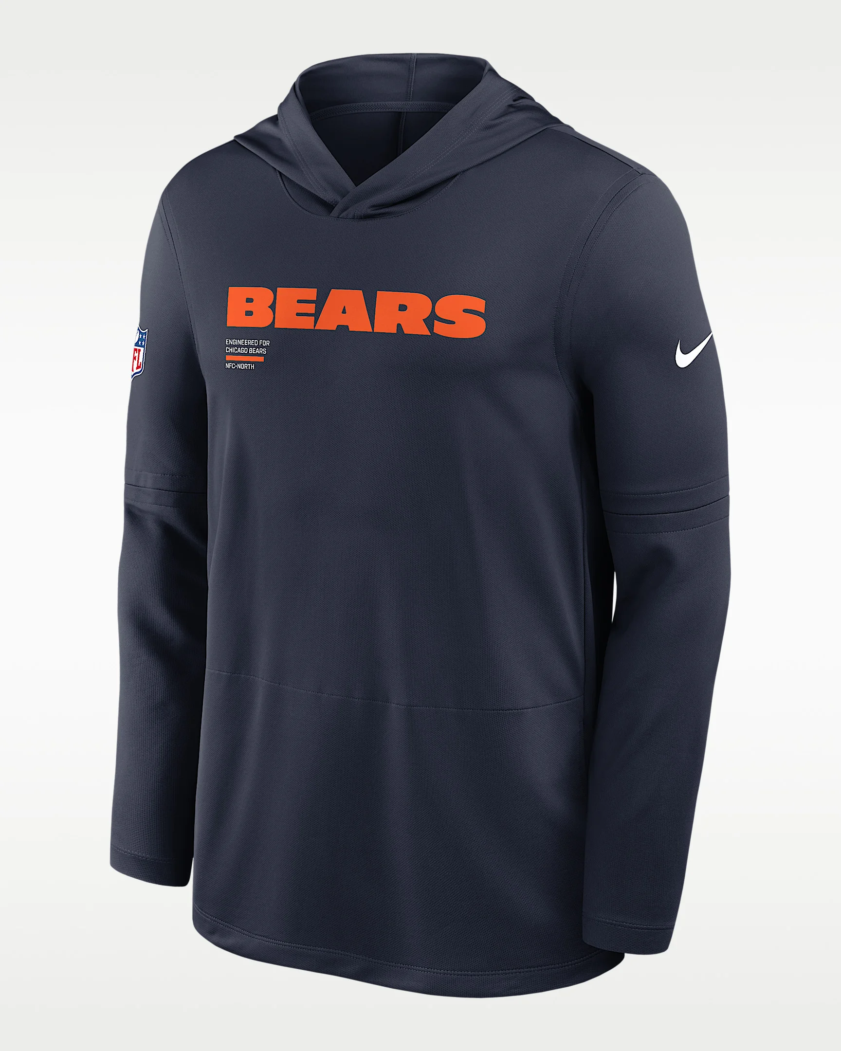 Perfect for lightweight coverage, the Pure Fury Sideline Top helps you comfortably support the Chicago Bears. It features sweat-wicking technology for ultimate comfort. Benefits - Nike Dri-FIT technology moves sweat away from your skin for quicker evaporation, helping you stay dry and comfortable. - Removable sleeves help add versatility for various conditions. Product Details - Front pocket - Hood without drawstring - 100% recycled polyester - Machine wash - Imported - Shown: Navy - Style: 03B941L7Q-P8B