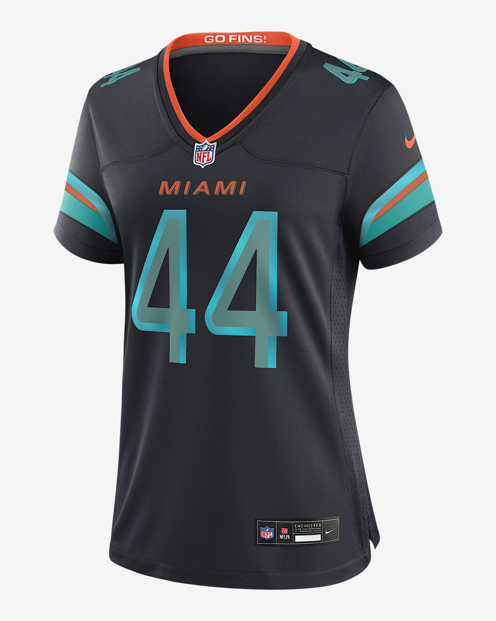 This Chop Robinson Rivalries Collection Jersey is a homage to the relentless swagger of an apex predator and a team that hunts in dark waters. The authentic look features a blue backdrop with unmistakable orange accents representing a squad that’s as fierce as they come. Breathable mesh panels and a form fit help provide a dry, comfortable feel that's ideal for Miami Dolphins game days. Benefits - Screen-printed name, number and team mark offer lightweight durability. - Ventilation over major heat zones helps keep you cool. Product Details - Standard fit for a relaxed, easy feel - NFL shield at V-neck - Tagless neck label - Woven jock tag - 100% recycled polyester - Machine wash - Imported - Shown: Navy - Style: 67NW0G649PF-FZ0