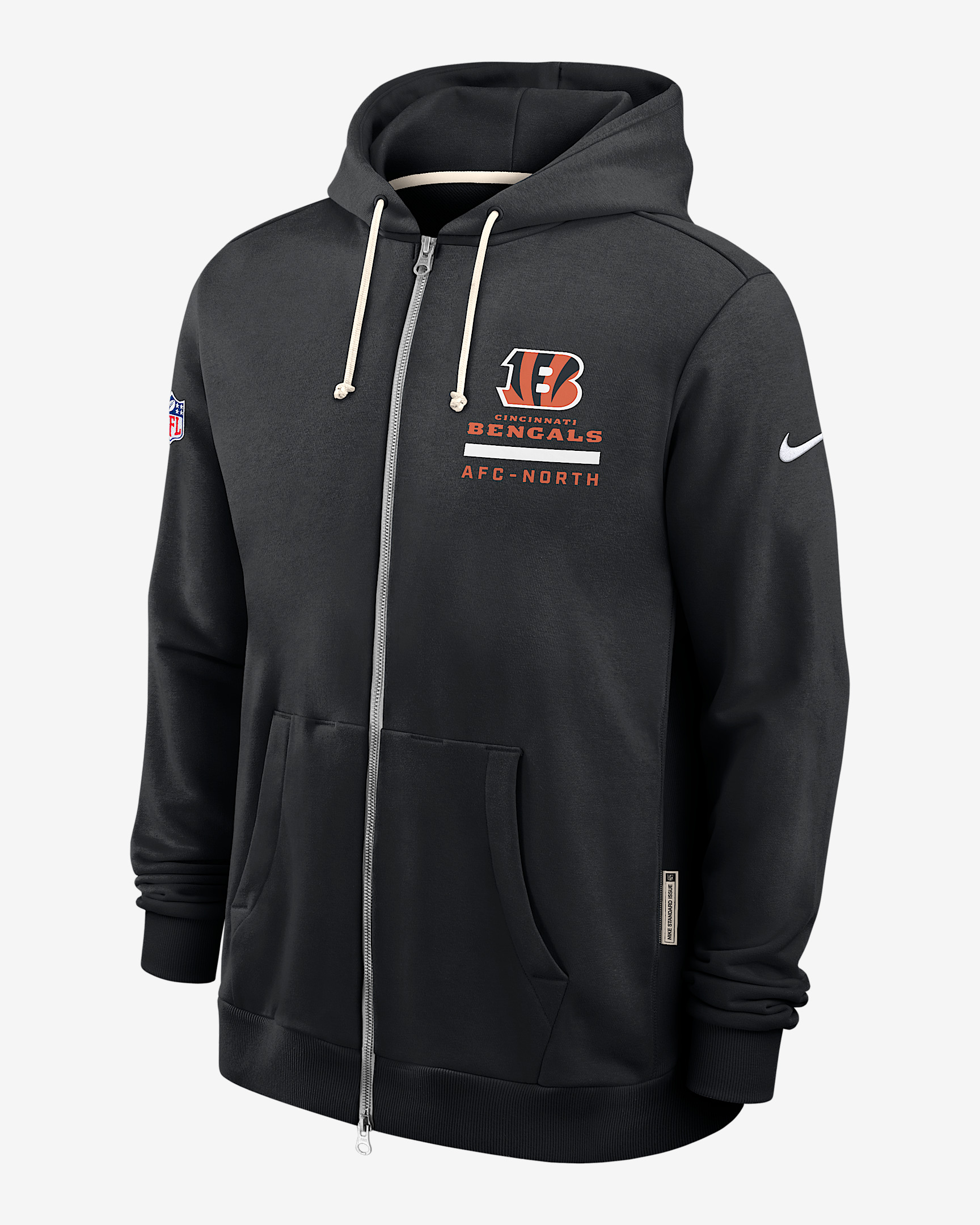 This Cincinnati Bengals Utility Player Sideline Hoodie combines sweat-wicking technology with a soft fleece lining to help create a warm, comfortable feel in cold temps. Benefits - Nike Dri-FIT technology moves sweat away from your skin for quicker evaporation, helping you stay dry and comfortable. - Dolman sleeves help increase range of motion with a roomy fit under the arms. Product Details - Hood with drawstring - Front pocket - Zippered pocket at right side - 53% polyester/47% cotton - Machine wash - Imported - Shown: Black - Style: 03AV00A9A-2FB