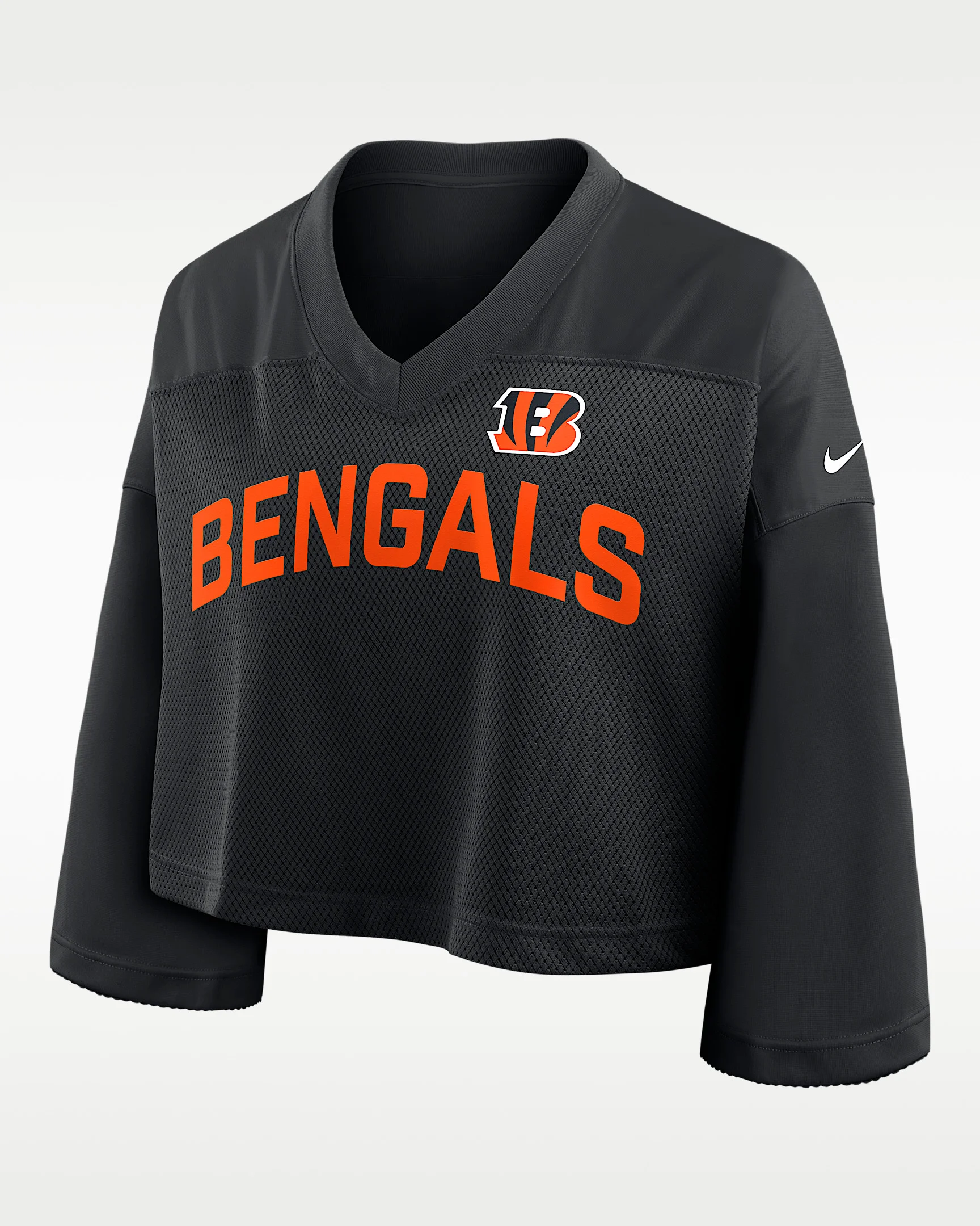 The Wide Receiver Jersey Fashion Top provides a trendy show of Cincinnati Bengals support with a cropped design and bold team graphics. Its polyester fabric is enhanced with sweat-wicking technology to help deliver added comfort. Benefits - Nike Dri-FIT technology moves sweat away from your skin for quicker evaporation, helping you stay dry and comfortable. - Dropped shoulder seams help create an oversized look. Product Details - 100% polyester - Machine wash - Imported - Shown: Black - Style: 03O300A9A-5HX