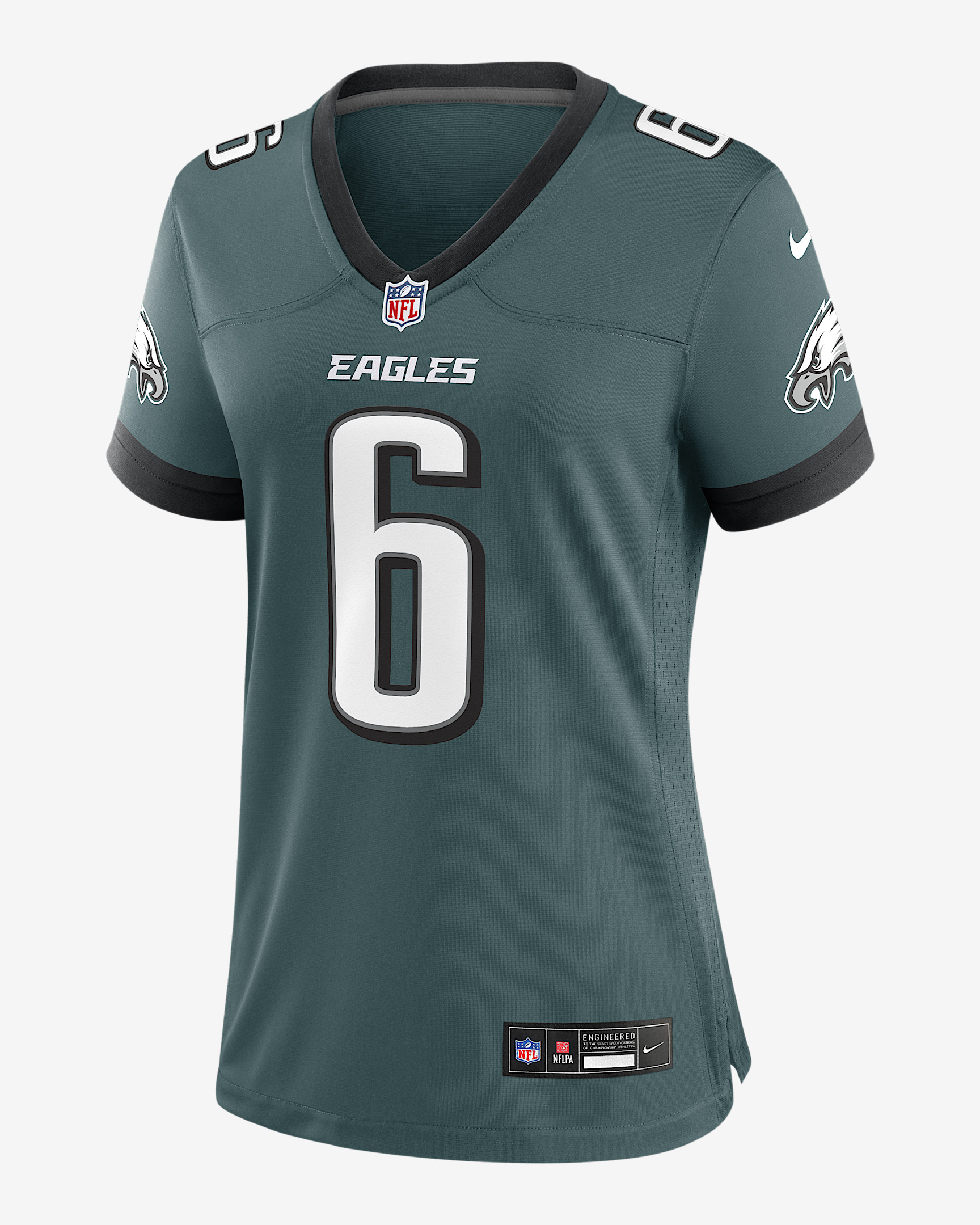 Rep one of your team's top stars with this DeVonta Smith Jersey. Proper ventilation and a form fit help provide a dry, comfortable wear with the authentic look of the on-field uniform for the Philadelphia Eagles. Benefits - Screen-printed name, number and team mark offer lightweight durability. - Ventilation over major heat zones helps keep you cool. Product Details - Standard fit for a relaxed, easy feel - NFL shield at V-neck - Tagless neck label - Woven jock tag - 100% polyester - Machine wash - Imported - Shown: Green - Style: 67NW0ABR86F-00S