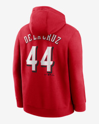 Designed with large graphics on the front and back, this Elly De La Cruz Club Hoodie features brushed-back fleece lining to help you comfortably support the Cincinnati Reds in chilly temperatures. Product Details - Front pocket - Hood with drawstring - MLB N&N Hoodies - Machine wash - Imported - Shown: Red - Style: NKDK62QRE9-L1U