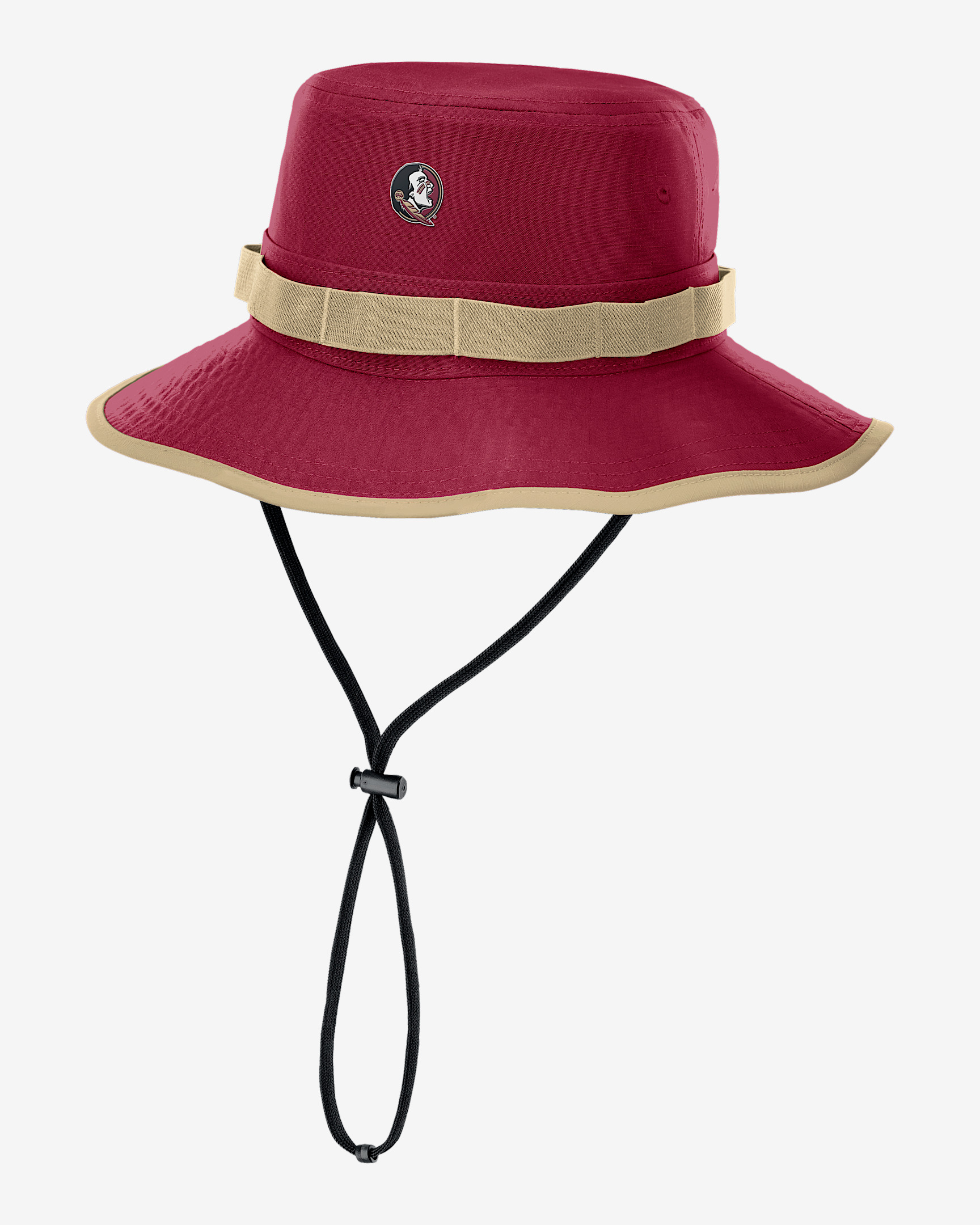The Florida State Sideline Apex Gameday Boonie Hat is perfect for the outdoors with a classic bucket design and wraparound brim providing 360-degree coverage. It pairs durable ripstop fabric with sweat-wicking technology for a cool, dry accessory. Benefits - Nike Dri-FIT technology moves sweat away from your skin for quicker evaporation, helping you stay dry and comfortable. - Adjustable chin strap with toggle helps keep the hat secure and in place. Product Details - 100% polyester - Hand wash - Imported - Shown: Garnet - Style: NC1B08DEFTN-CVH