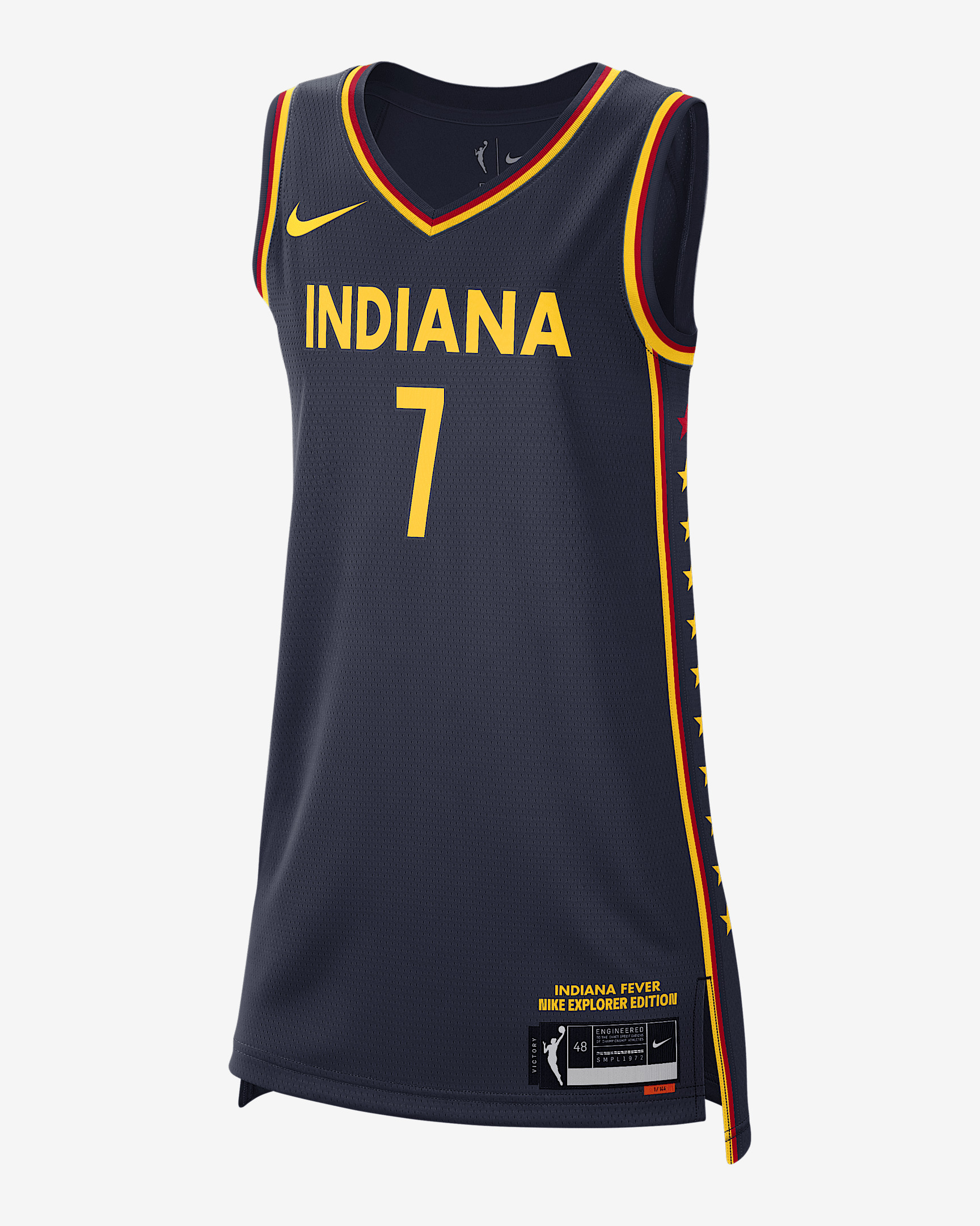 The Nike WNBA Explorer Edition Victory Jersey of the Indiana Fever represents the team's home and history. It's made from double-knit mesh with sweat-wicking technology. The jersey has star details inspired by an iconic monument in Indianapolis. Product Details - Ribbed neckline and armholes - Heat-applied graphics - Sewn-on jock tag - 100% polyester - Machine wash - Imported - Shown: College Navy - Style: DJ4568-421 SIZE & FIT Loose fit: roomy and relaxed