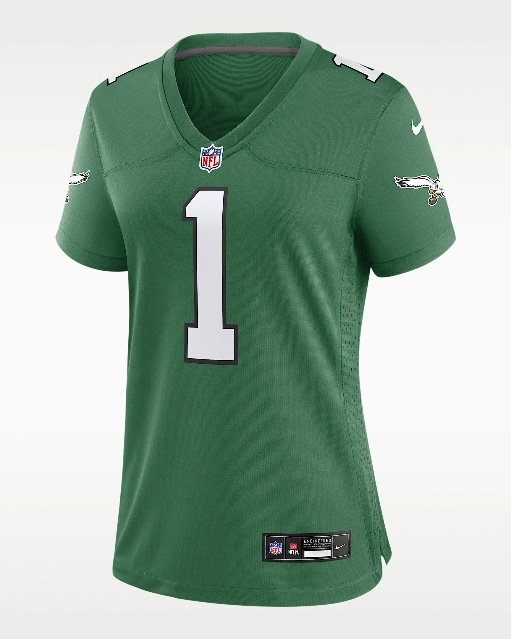 Rep one of your team's top stars with this Philadelphia Eagles Jersey. Proper ventilation and a form fit help provide a dry, comfortable wear with the authentic look of the on-field uniform. Benefits - Screen-printed name, number and team mark offer lightweight durability. - Ventilation over major heat zones helps keep you cool. Product Details - Standard fit for a relaxed, easy feel - NFL shield at V-neck - Tagless neck label - Woven jock tag - 100% polyester - Machine wash - Imported - Shown: Kelly Green - Style: 67NW03T786F-CY0