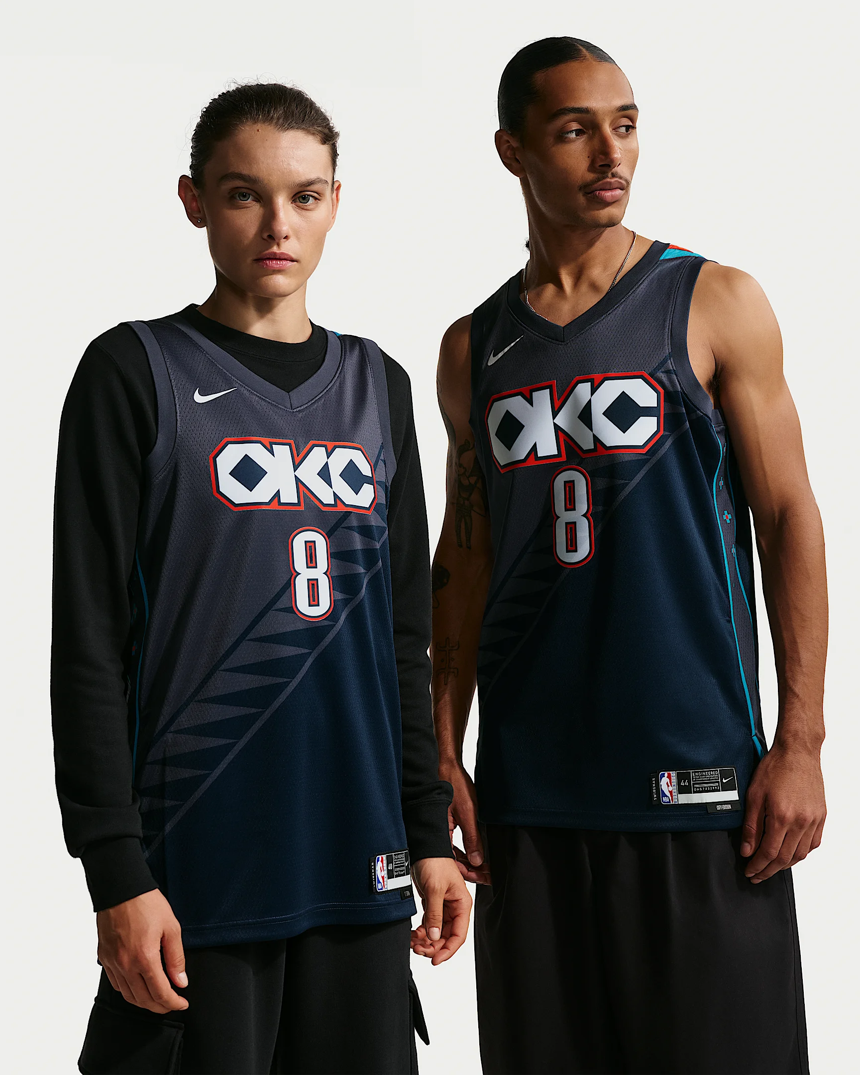 The Oklahoma City Thunder 2025-26 City Edition jersey continues to tell a story of community and passion built by those who came before. At the heart of the uniform, geometric shapes link to form the city’s name. Interlocking as one shape creating the OKC letters, it builds a bold convergence of community, strength, and belonging. Inspired by the Oklahoma River that binds the north and south sides of the city, water-like teeth bridge the duotone colors, uniting both halves of the jersey into one. The Thunder sunset-colored sash is symbol of the identity and a tribute to the resilience of Oklahoma’s tribes and the state that continue to build together. The 11 geometric stars, representing the stories passed down from one generation to the next. Product Details - 100% polyester - Machine wash - Imported - Shown: Thunder Blue - Style: HM5990-439 SIZE & FIT Model is wearing size M and is 6′1″185cm Standard fit: easy and traditional