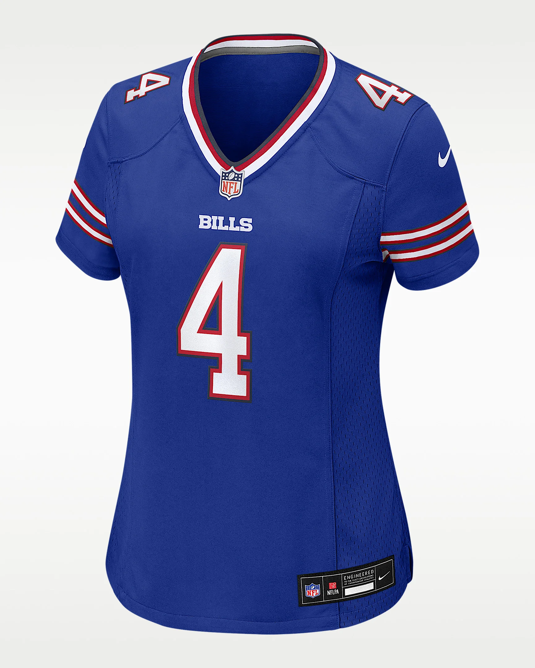 Rep one of your team's top stars with this James Cook III Jersey. Proper ventilation and a form fit help provide a dry, comfortable wear with the authentic look of the on-field uniform for the Buffalo Bills. Benefits - Screen-printed name, number and team mark offer lightweight durability. - Ventilation over major heat zones helps keep you cool. Product Details - Standard fit for a relaxed, easy feel - NFL shield at V-neck - Tagless neck label - Woven jock tag - 100% polyester - Machine wash - Imported - Shown: Royal - Style: 67NWBBGH81F-RZ6