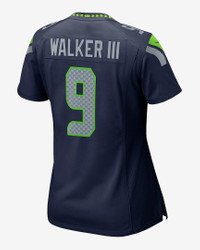 Rep one of your team's top stars with this Kenneth Walker III Jersey. Proper ventilation and a form fit help provide a dry, comfortable wear with the authentic look of the on-field uniform for the Seattle Seahawks. Benefits - Screen-printed name, number and team mark offer lightweight durability. - Ventilation over major heat zones helps keep you cool. Product Details - Standard fit for a relaxed, easy feel - NFL shield at V-neck - Tagless neck label - Woven jock tag - 100% polyester - Machine wash - Imported - Shown: Navy - Style: 67NWSSGH78F-696