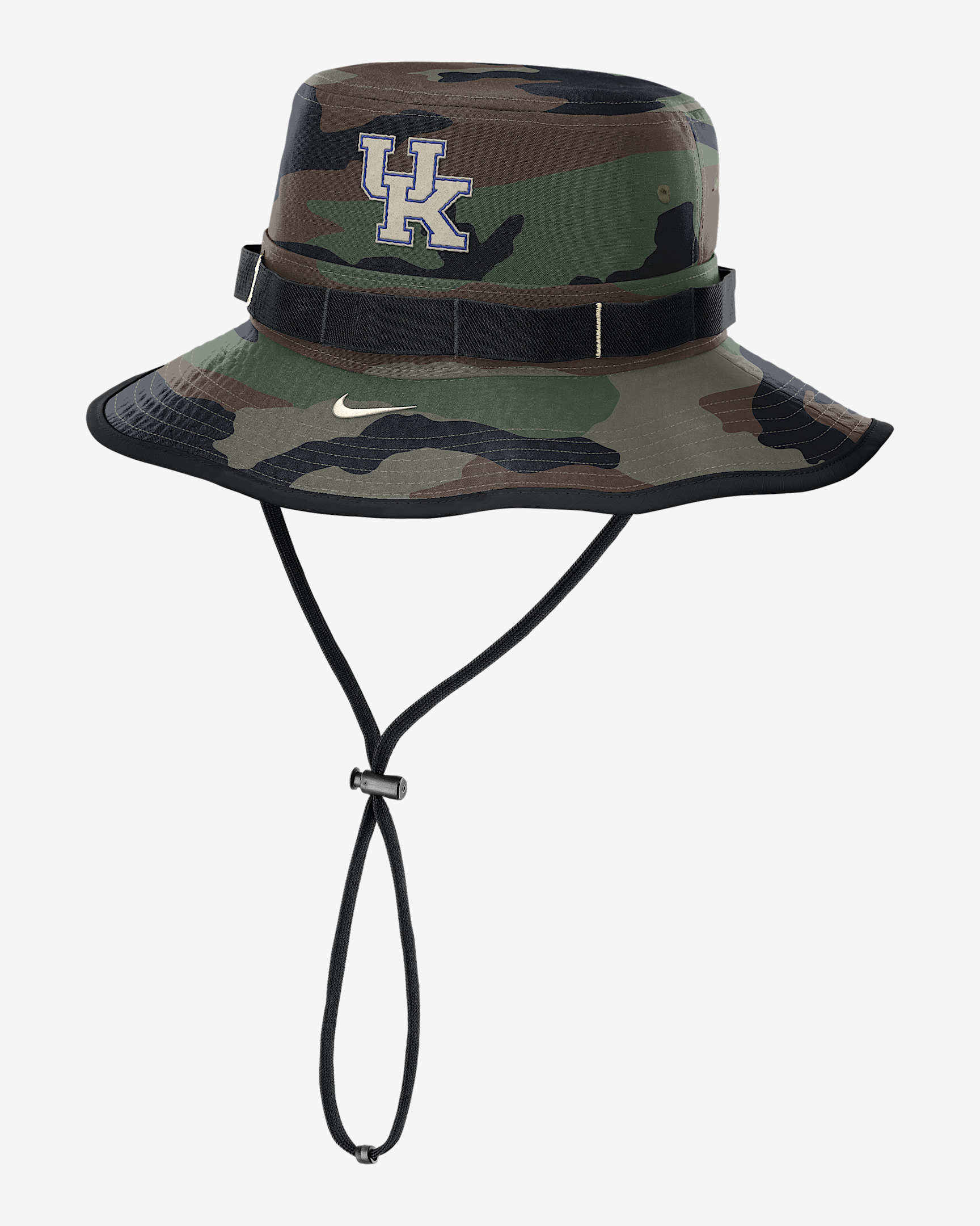 Featuring a camo pattern, the Kentucky Military Appreciation Boonie Hat is crafted for the outdoors with a classic bucket design and wraparound brim providing 360-degree coverage. It pairs durable ripstop fabric with sweat-wicking technology for a cool, dry accessory. Benefits - Nike Dri-FIT technology moves sweat away from your skin for quicker evaporation, helping you stay dry and comfortable. - Adjustable chin strap with toggle helps keep the hat secure and in place. Product Details - Daisy chain webbing around the crown - Embroidered eyelets - 100% polyester - Hand wash - Imported - Shown: Olive - Style: NC6410P5NKY-TL1
