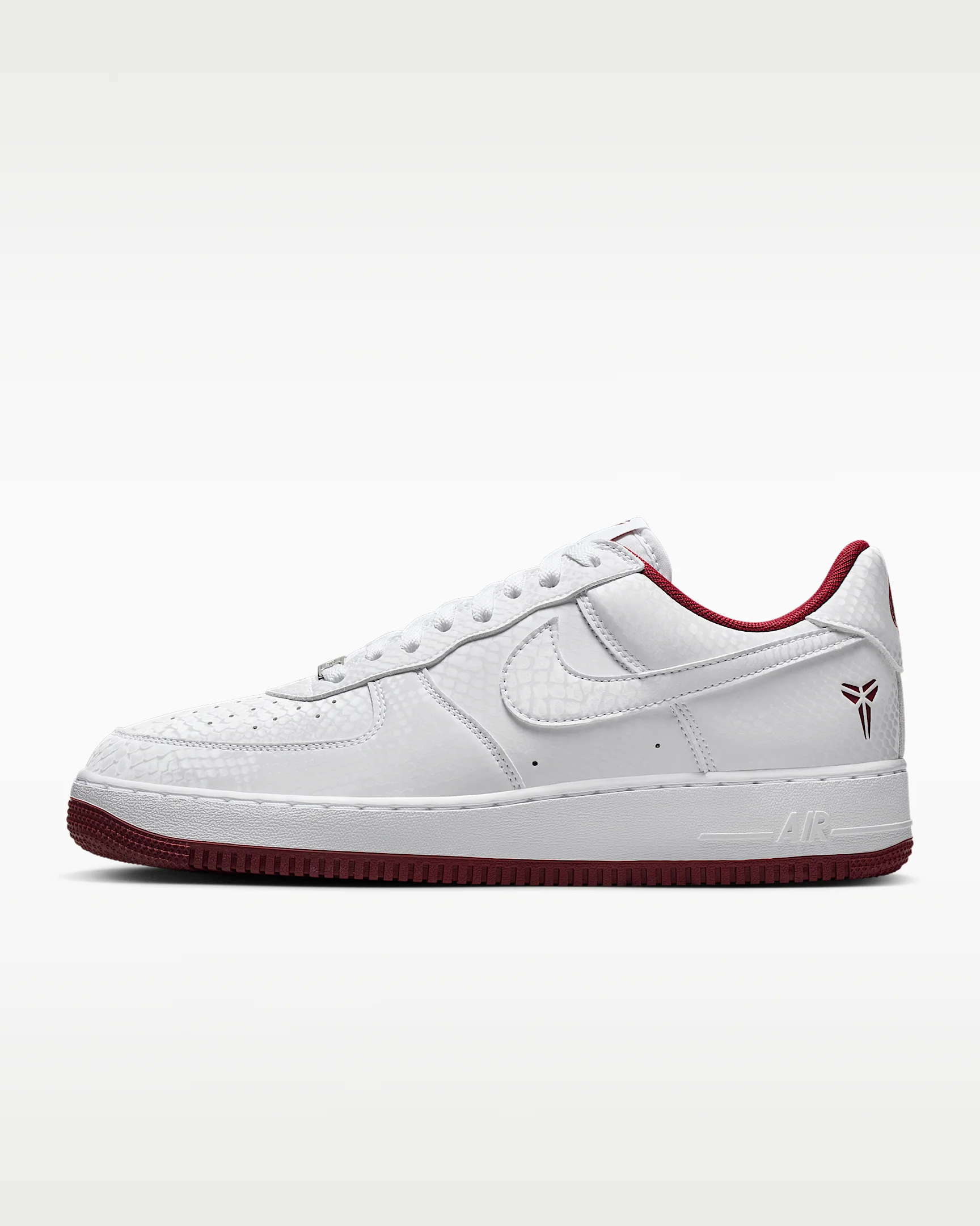 This special-edition AF1 is infused with Mamba DNA, like the allover snakeskin print—putting a distinct spin on an all-time classic. The embroidered number and emblem on the heel pay homage to Kobe's alma mater, while Sheath logos on the tongue and outer heel add signature branding. Lastly, this pair comes complete with special "Mamba Forever" lace dubraes. Benefits - Synthetic leather upper with perforated toe box is breathable and comfortable. - Nike Air unit provides lightweight cushioning. - Rubber outsole with heritage hoops pivot circles delivers traction and durability. Product Details - Padded collar - Foam midsole - Shown: White/Team Red - Style: IB0018-101