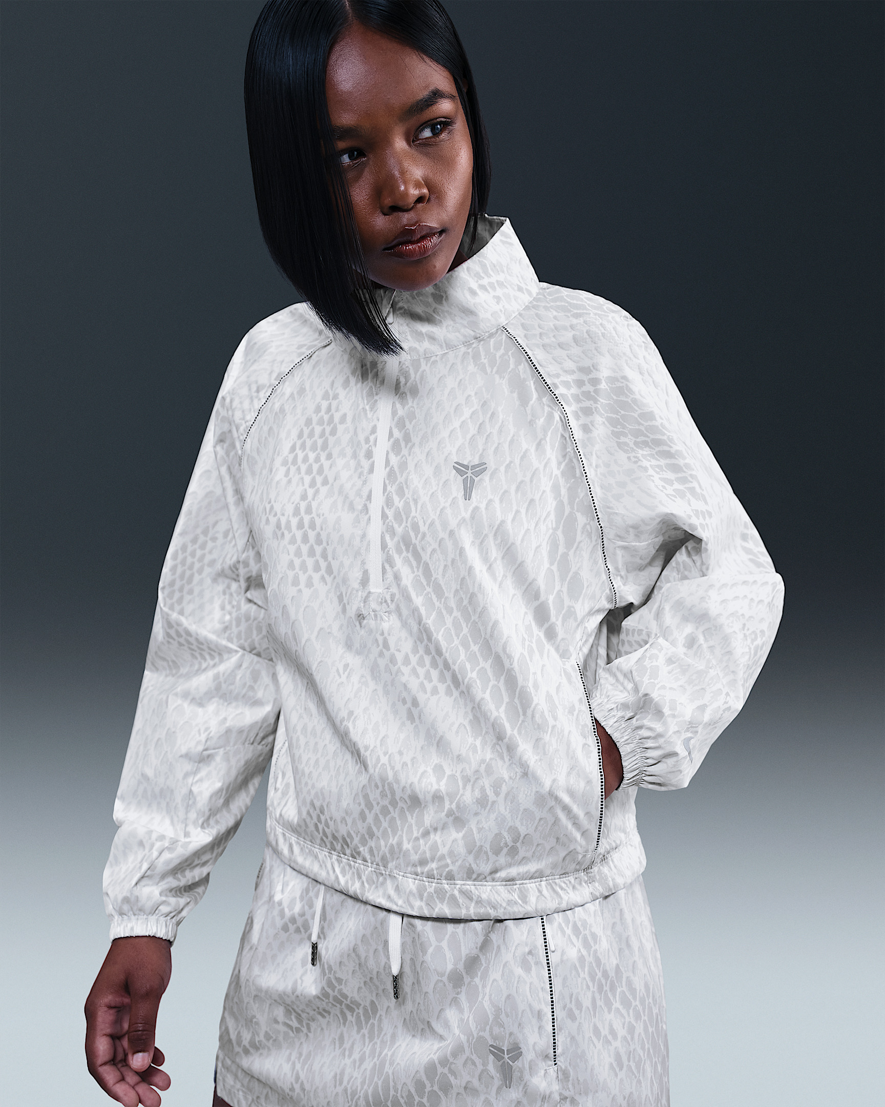 Move with mamba energy. This lightweight, breathable jacket has a snakeskin print and reflective details that give your look a bold edge. An adjustable hem lets you cinch it up for a cropped look or keep it loose for a roomy feel. Benefits - Adjustable hem lets you personalize your style. - Mesh zip pockets offer secure lightweight storage. Product Details - Elastic cuffs - Reflective Kobe Sheath logo on front and back - Swoosh logo on arm - Body/Lining: 100% polyester - Machine wash - Imported - Not intended for use as Personal Protective Equipment (PPE) - Shown: White - Style: IB2718-100 SIZE & FIT Model is wearing size S and is 5′7″170cm Standard fit: easy and traditional