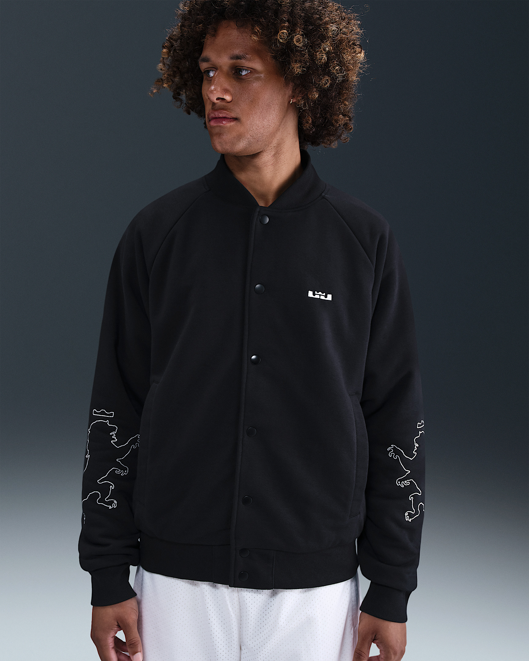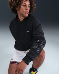 This premium Therma-FIT jacket celebrates LeBron’s reign that’s stood the test of time. Built for cold weather, it combines performance fleece and quilted synthetic insulation for unmatched warmth worthy of basketball royalty. Product Details - Snap-button front closure - Welted hand pockets - Ribbed collar, cuffs and hem - Body: 54% polyester/46% cotton. Rib: 96% cotton/4% spandex. Lining/Fill: 100% polyester. - Machine wash - Imported - Shown: Black/Sail/Black - Style: HV3498-010 SIZE & FIT Model is wearing size M and is 6′2″188cm Standard fit: easy and traditional
