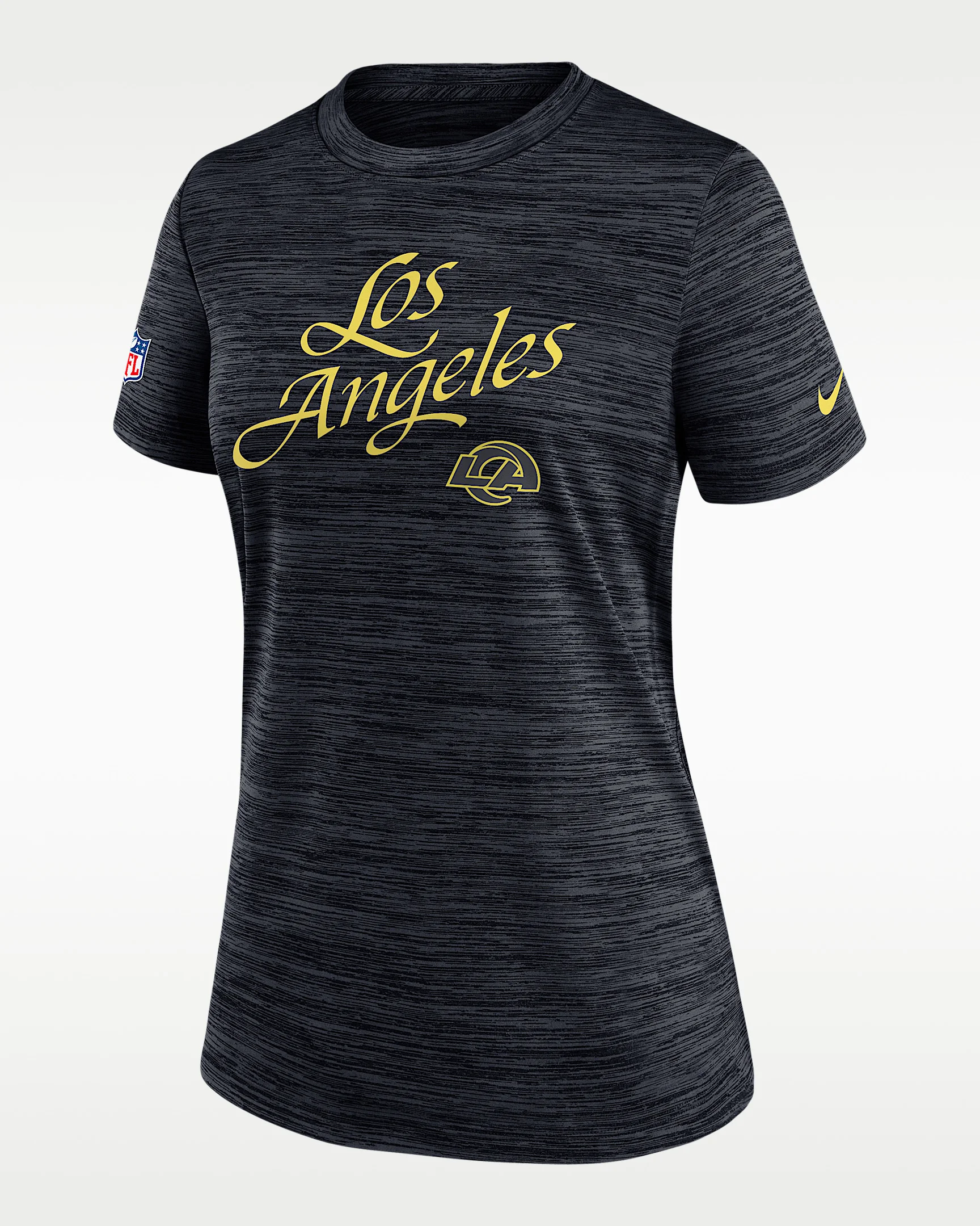 The Los Angeles Rams Rivalries Collection Sideline Velocity T-Shirt is inspired by a city full of ambition and a fanbase that puts in work when no one’s watching. A cross-dyed pattern in midnight blue with brilliant Sol yellow details represents all those long nights that will soon pay off. Lightweight polyester combined with sweat-wicking technology helps keep you cool and dry in this exclusive team shirt. Benefits - Nike Dri-FIT technology moves sweat away from your skin for quicker evaporation, helping you stay dry and comfortable. - Jersey fabric has a soft, lightweight feel. Product Details - Shown: Navy - Style: 03EY4FA95-0M2