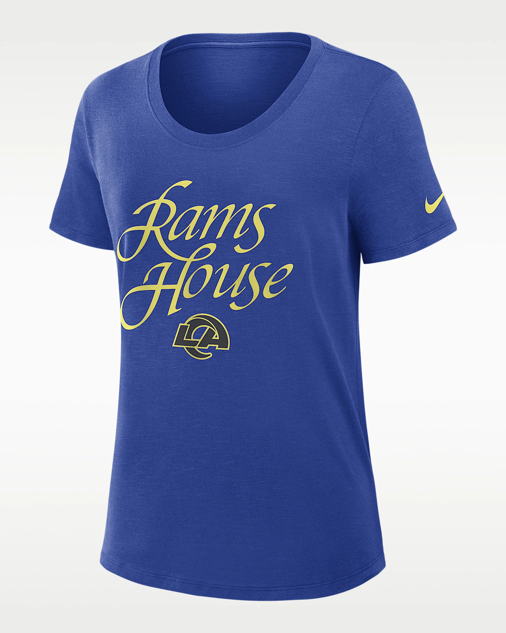 The Los Angeles Rams Rivalries Collection Slub T-Shirt is inspired by a city full of ambition and a fanbase that puts in work when no one’s watching. A royal backdrop with brilliant Sol yellow represents all those long nights that will soon pay off. Lightweight cotton-polyester material combined with sweat-wicking technology helps keep you cool and dry in this exclusive team tee. Benefits - Nike Dri-FIT technology moves sweat away from your skin for quicker evaporation, helping you stay dry and comfortable. - Jersey fabric has a soft, lightweight feel. Product Details - Shown: Navy - Style: 03484EV95-FY4