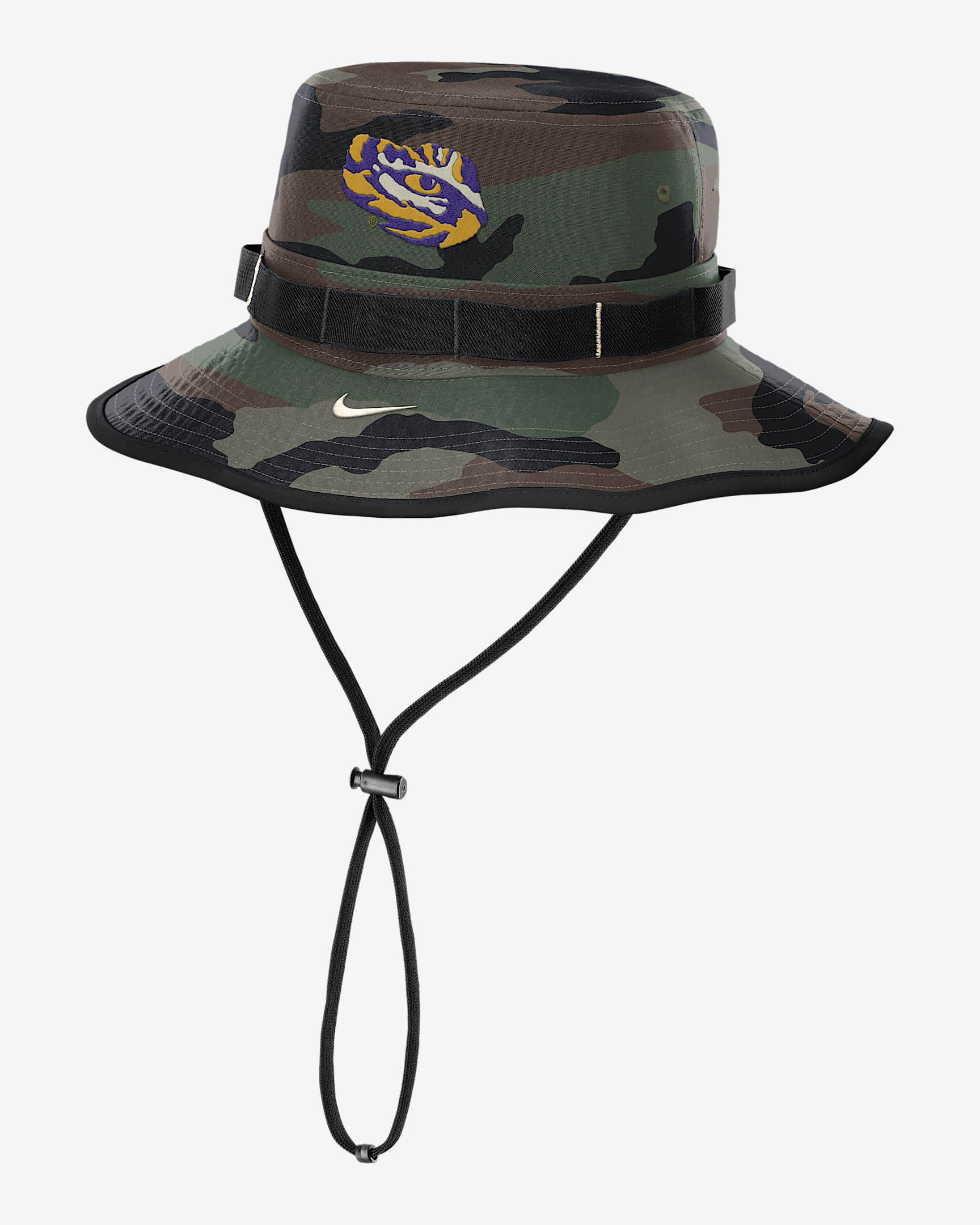 Featuring a camo pattern, the LSU Military Appreciation Boonie Hat is crafted for the outdoors with a classic bucket design and wraparound brim providing 360-degree coverage. It pairs durable ripstop fabric with sweat-wicking technology for a cool, dry accessory. Benefits - Nike Dri-FIT technology moves sweat away from your skin for quicker evaporation, helping you stay dry and comfortable. - Adjustable chin strap with toggle helps keep the hat secure and in place. Product Details - Daisy chain webbing around the crown - Embroidered eyelets - 100% polyester - Hand wash - Imported - Shown: Olive - Style: NC6410P5LSN-TL1