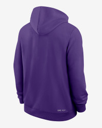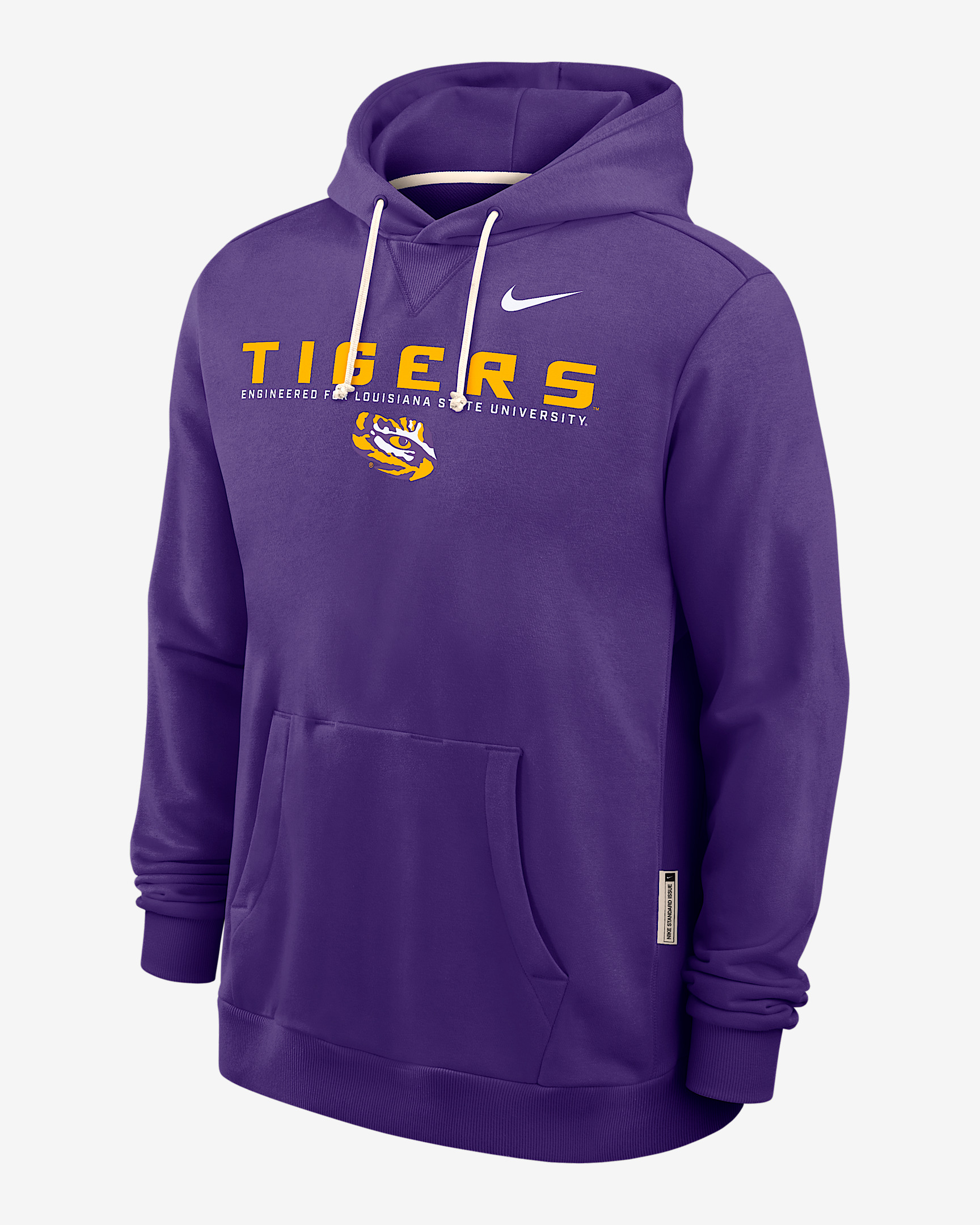 Featuring bold team graphics, the Sideline Hoodie combines sweat-wicking technology with a soft fleece lining to help you comfortably support LSU in cooler weather. Benefits - Nike Dri-FIT technology moves sweat away from your skin for quicker evaporation, helping you stay dry and comfortable. - Dolman sleeves help increase range of motion with a roomy fit under the arms. Product Details - Hood with drawstring - Front pocket - Zippered pocket at right side - 53% polyester/47% cotton - Machine wash - Imported - Shown: Purple - Style: 03AZ51LLSN-HSY