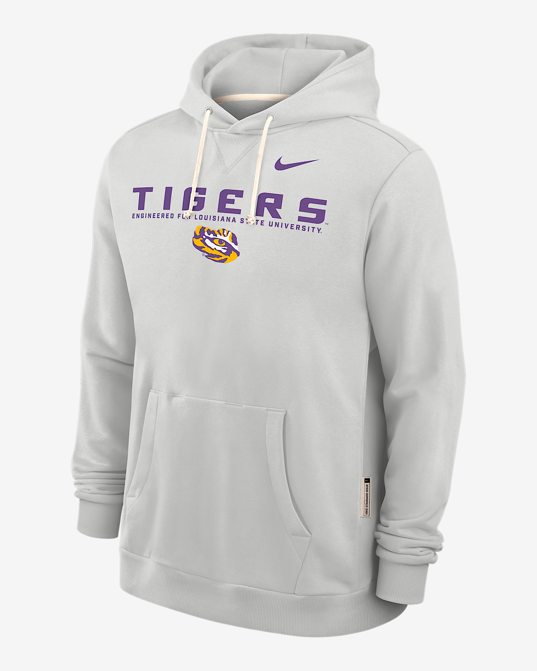 Featuring bold team graphics, the Sideline Hoodie combines sweat-wicking technology with a soft fleece lining to help you comfortably support LSU in cooler weather. Benefits - Nike Dri-FIT technology moves sweat away from your skin for quicker evaporation, helping you stay dry and comfortable. - Dolman sleeves help increase range of motion with a roomy fit under the arms. Product Details - Hood with drawstring - Front pocket - Zippered pocket at right side - 53% polyester/47% cotton - Machine wash - Imported - Shown: Grey - Style: 03AZ0BBLSN-HSY
