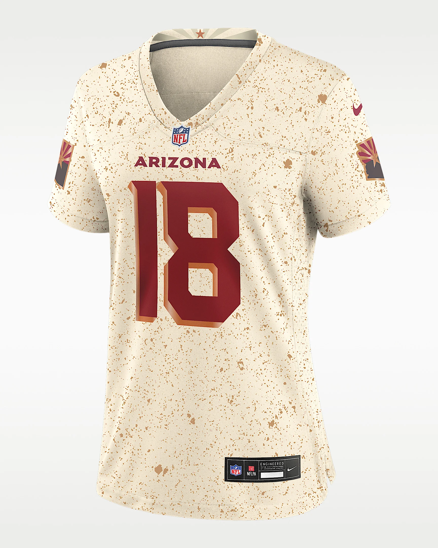 This Marvin Harrison Jr. Rivalries Collection Jersey is a testament to a team and fanbase with a resilience like no other. The authentic look features the Arizona flag and bold red flashes against a desert motif to represent the harsh land the Arizona Cardinals call home. Breathable mesh panels and a form fit help provide a dry, comfortable feel that's ideal for game days. Benefits - Screen-printed name, number and team mark offer lightweight durability. - Ventilation over major heat zones helps keep you cool. Product Details - Standard fit for a relaxed, easy feel - NFL shield at V-neck - Tagless neck label - Woven jock tag - Shown: Natural - Style: 67NW0G619CF-ZZ1