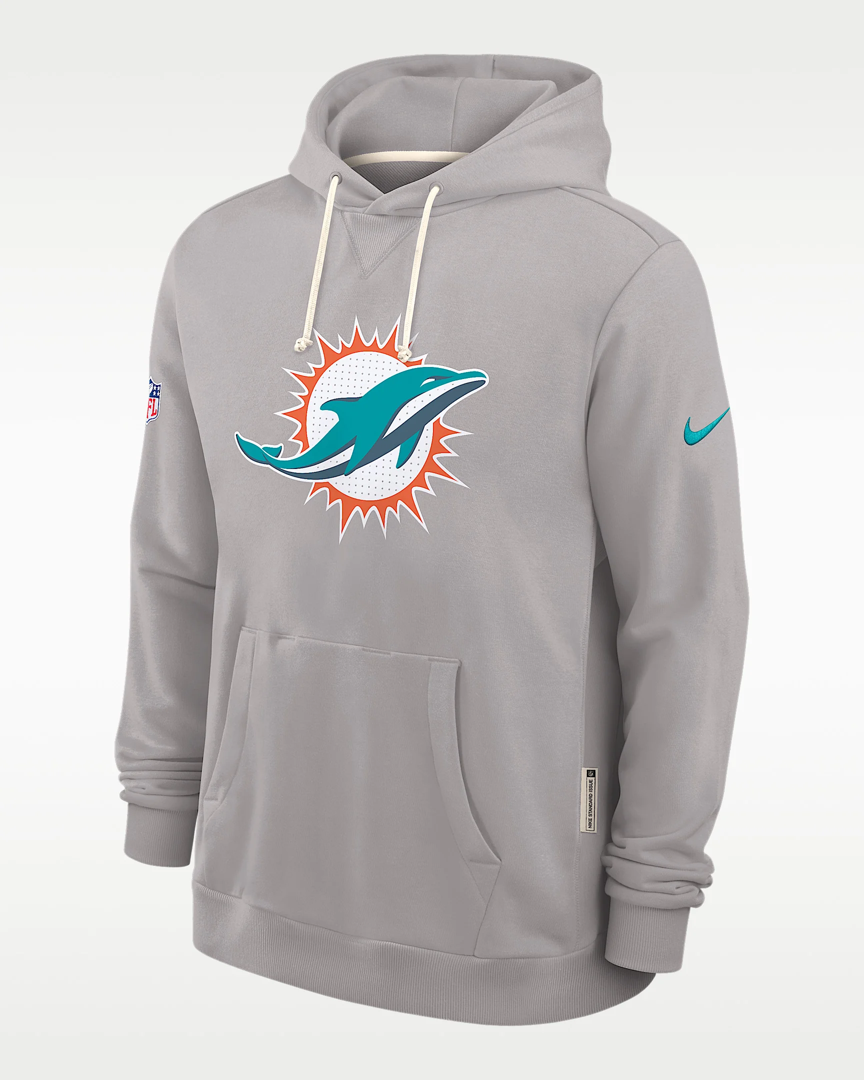 Featuring bold team graphics, the Initial Home Sideline Hoodie combines sweat-wicking technology with a soft fleece lining to help you comfortably support the Miami Dolphins in cooler weather. Benefits - Nike Dri-FIT technology moves sweat away from your skin for quicker evaporation, helping you stay dry and comfortable. - Dolman sleeves help increase range of motion with a roomy fit under the arms. Product Details - Hood with drawstring - Front pocket - Zippered pocket at right side - 53% polyester/47% cotton - Machine wash - Imported - Shown: Pewter - Style: 03AZ09T9P-A0M